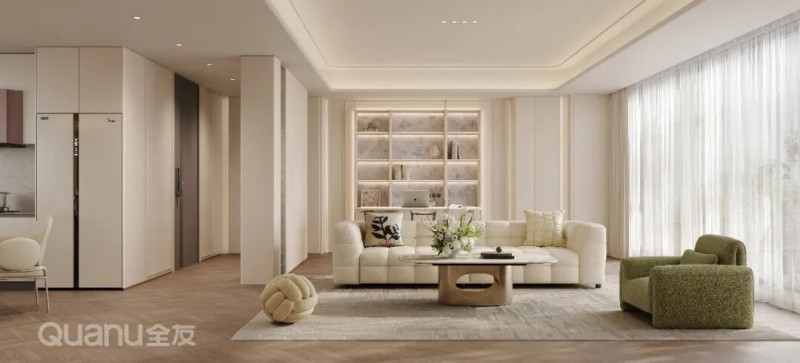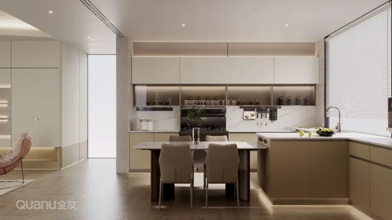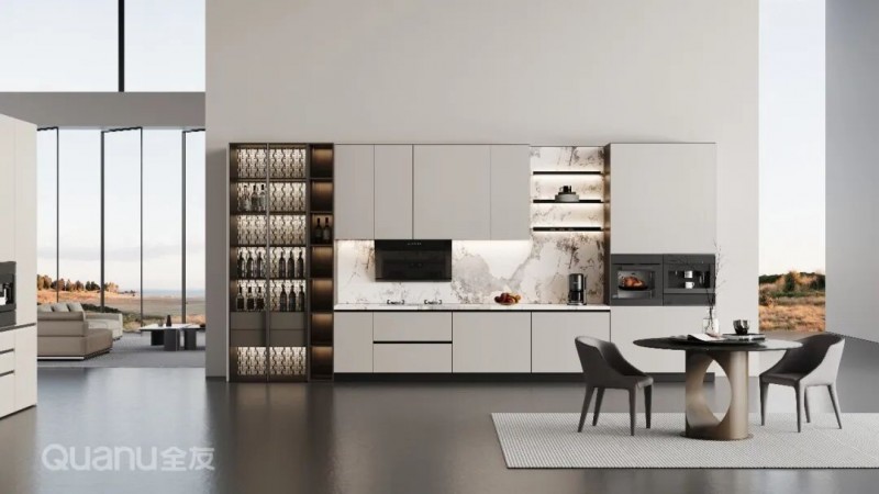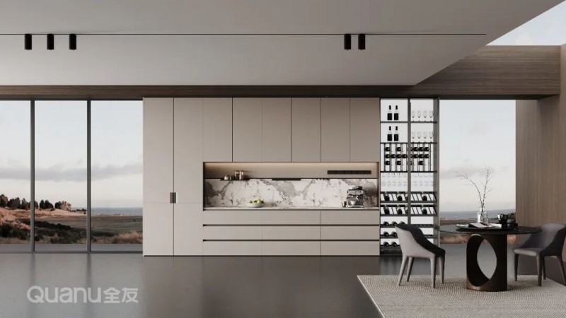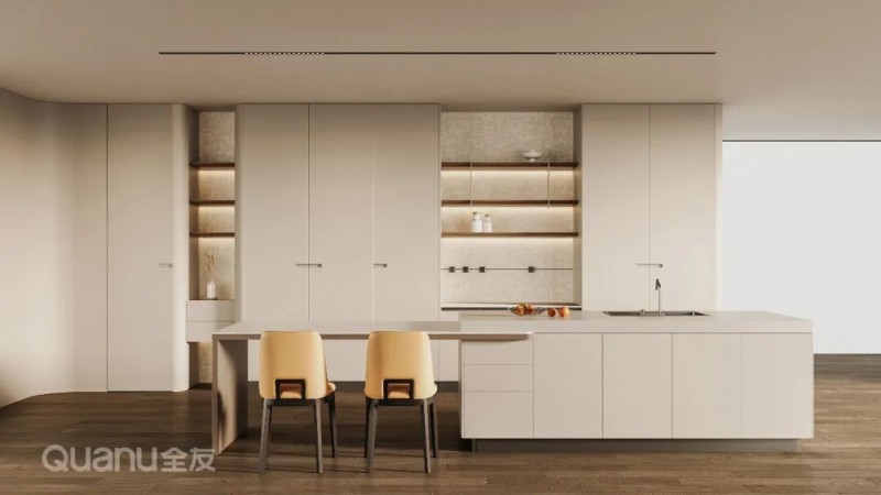 全友全屋定制:屿境+系列 两者都具备颜值高、易清洁、环保性好的优点,但缺点是价格中等偏上,并且不能做复杂造型。适合追求健康环保材质、简约高级感的家庭。