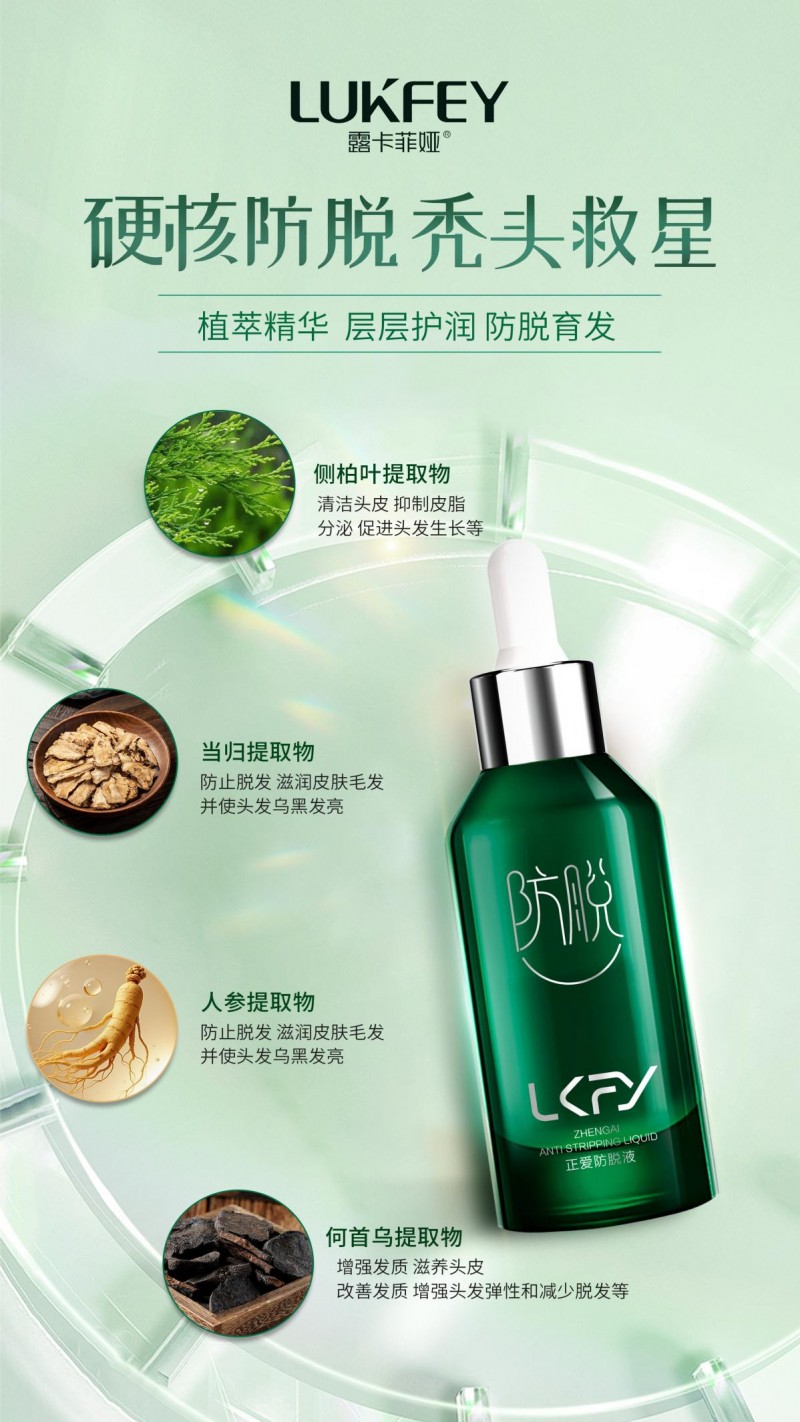 露卡菲娅防脱精华液其用户覆盖熬夜脱发、产后脱发、脂溢性脱发等多种类型,真正实现了“一瓶应对多重脱发困扰”的产品定位。 三重协同防脱体系 露卡菲娅防脱精华液的核心防脱逻辑建立在“抑制DHT—激活毛囊—修护头皮”三重协同机制上: 抑制DHT,阻断脱发根源:添加25%侧柏叶提取物与20%何首乌提取物,协同抑制5α-还原酶活性,减少攻击毛囊的二氢睾酮(DHT)生成,从源头阻断脂溢性、压力型脱发。 激活毛囊,唤醒新生潜能:15%当归提取物与12%人参提取物可扩张头皮毛细血管,促进血液循环,为毛囊输送充足营养;独家专研生发因子穿透头皮屏障,调控生长信号通路,唤醒休眠毛囊。 修护头皮,优化生长环境:姜根、知母、牡丹根提取物构建抗炎-抗氧化矩阵,调节头皮水油平衡,修复受损屏障,抑制马拉色菌繁殖,为毛囊营造健康微环境。