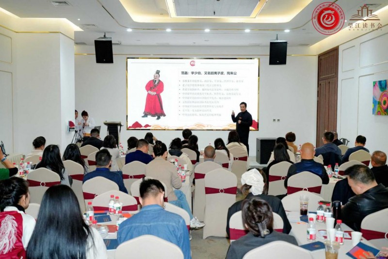 讲座正式开始前,望江读书会秘书长,成都绮客文化董事长李诺言女士进行了热情洋溢的欢迎致辞,她介绍了望江读书会的发起缘由和使命理念,希望大家能够通过阅读好书增强自己的个人魅力修养。在李诺言的邀请下,四川省川商联合会会长,四川师范大学成都校友会会长陶振华先生、东方木兰荟四川会长、成都市女企业家协会副会长孙婍瑄女士也登台致辞,对读书会活动的举办予以支持和厚望。 在《老子思想与商圣范蠡》的分享讲座中,“道商之师”李海波首先介绍了他2016年出版的图书作品《道商范蠡》。作为春秋末年的政治家、军事家和商业经济家,范蠡在帮助越王勾践实现越国复兴后功成身退,他是如何实现“十九年中三致千金”的财富人生,留下了“富而好行其德”的历史评价?在范蠡那句看似轻描淡写的“我不求财而财自来”的语录背后,到底是什么力量和智慧助力他成为千秋商圣,可以让数千年的中国商人集体顶礼膜拜,以“陶朱之富”的道商成就为终生梦想……李海波认为,很多人只关注范蠡成功的表象故事,热衷于吴越争霸那段历史背后范蠡运筹帷幄的智慧身影,往往会忽略让一个人走向持续成功的思想认知和智慧传承。