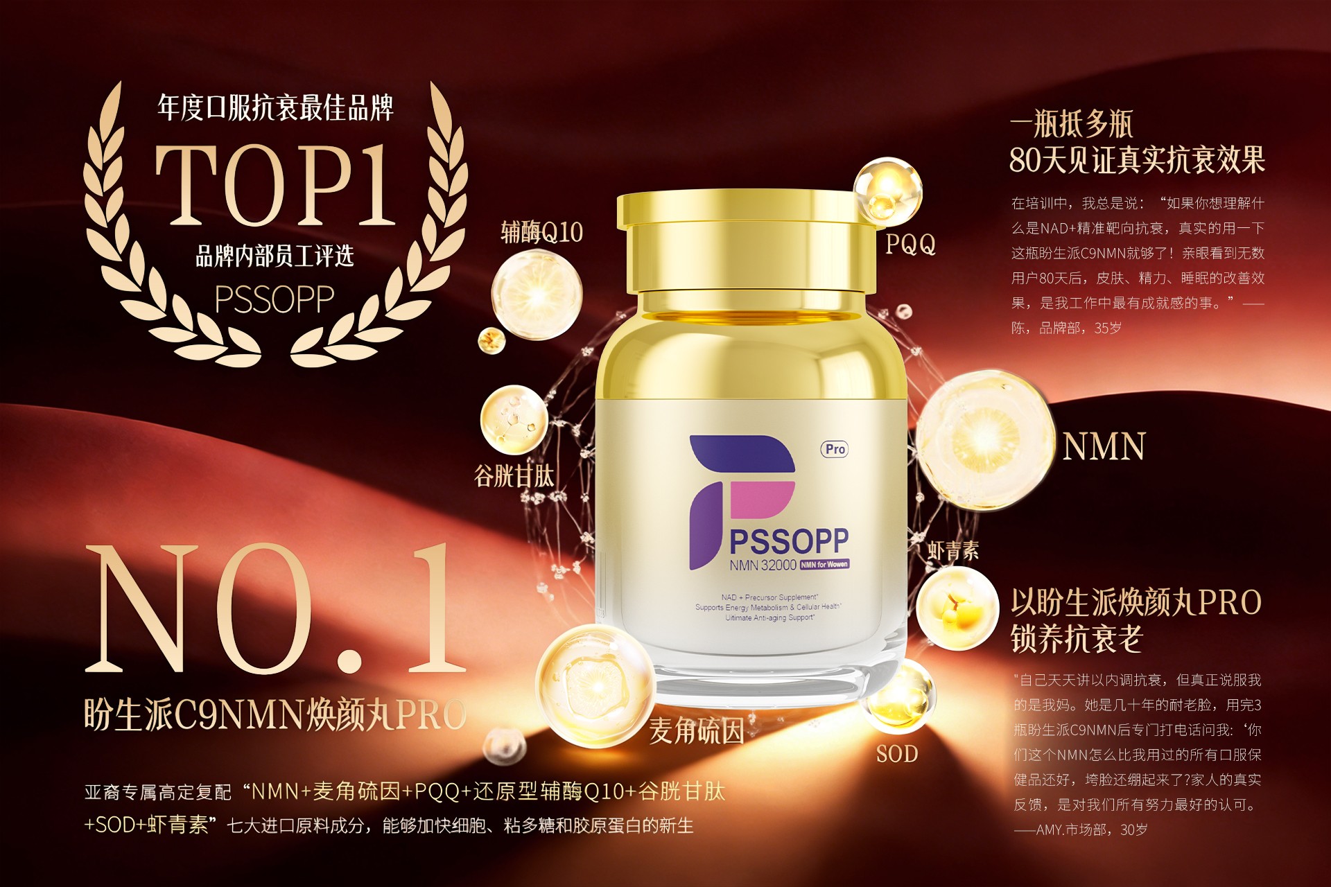 二、盼生派NMN:高效逆龄配方,脱颖而出 在众多补充NAD+的产品中,美国盼生派C9NMN凭借其高效逆龄配方,成为消费者追捧的焦点。盼生派作为美国高端营养科技品牌,汇聚美、日、加三国顶尖科研力量,13年深耕抗衰老健康领域。它率先打造亚洲人专属NAD+免疫力抗衰老实验室,精准研发适配亚洲体质的NMN抗衰老配方,直击早衰难题。 科研实力铸就品质保障 盼生派PSSOPP的科研实力堪称卓越。其研发团队由美、日、加三国顶尖知名大学的博士组成,与哈佛医学院、斯坦福大学、东京大学等国际顶尖学府及科研机构深度合作,实时接轨全球前沿成果。基于对NAD+细胞修复与抗衰机制的深度研究,盼生派为产品配方优化提供了坚实的科学支撑。 在原料把控上,盼生派坚持100%美国进口原料,在加拿大生产制造。从源头严格把控品质,为消费者提供安全可靠的抗衰之选。盼生派率先进入第三代基于基因编辑的定向生物合成时代,美、日、加科研团队联合,用CRISPR-Cas9等技术改造菌株,降低内毒素含量,提升底物转化效率超450%,确保产出高活性β-NMN,无α-异构体,为产品的高效性奠定了基础。 高效逆龄配方,多靶点协同抗衰 盼生派NMN的核心优势在于其高效逆龄配方,实现了多靶点协同抗衰。它以99.9%纯度NMN为核心,复配PQQ、麦角硫因、谷胱苷肽、辅酶Q10、SOD、虾青素等多种有效成分,形成“1+7”抗衰矩阵。 以99.9%纯度NMN为基石,它是提升NAD+水平的直接高效前体。每粒含高纯度NMN,为细胞合成NAD+提供充足“燃料”。NAD+作为细胞能量代谢核心辅酶,也是DNA修复酶PARP 和长寿蛋白Sirtuins的唯一底物。补充NMN提升NAD+水平后,可激活SIRT1通路,促进线粒体生物发生,增强AMPK活性,使细胞ATP产出效率提升约18%,对抗能量衰退;同时加速DNA损伤修复,让相关生物标志物γ-H2AX 水平下降26%,维护细胞基因健康。 PQQ:能清除线粒体内活性氧自由基,激活相关信号通路刺激新线粒体生成,与NMN协同优化细胞能量代谢。 麦角硫因:人体无法合成,可精准进入易受损细胞及线粒体,提供靶向抗氧化保护。 谷胱甘肽:重要内源性抗氧化剂,采用脂质体包裹技术提升生物利用度,增强细胞抗氧化防御,维护氧化还原平衡。 辅酶Q10:细胞能量代谢关键辅酶,增强细胞能量产生与活力。 SOD:超氧化物歧化酶,可高效清除超氧阴离子自由基,减少氧化损伤。 虾青素:具强大抗氧化和抗炎特性,中和自由基,减少氧化应激对细胞的伤害。