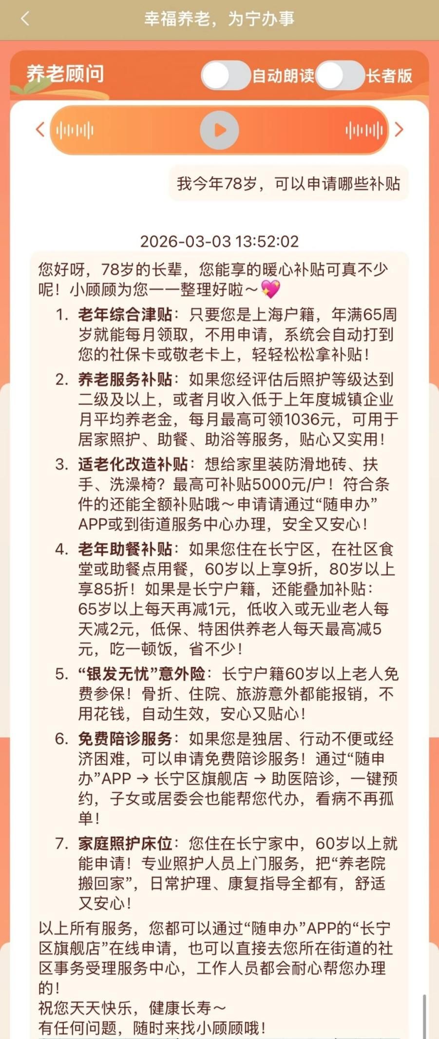 近日,由哲语人工智能公司提供核心AI技术支撑的随申办长宁区“养老顾问”智能服务模块正式上线。该模块作为长宁区“数字民政”3.0核心应用,依托哲语政务AI平台的技术优势,实现了养老服务的数字化、智能化与便捷化升级,成功打通养老服务“最后一米”,让老年群体享受到更精准、更高效、更暖心的智能咨询服务,也为长宁民政养老服务治理提质增效提供了坚实的技术保障。 技术赋能,政企协同构建智慧养老新体系 在长宁区民政局的牵头规划与统筹推进下,哲语人工智能公司深度参与长宁区“数字民政”管理平台3.0项目建设,聚焦养老服务领域的民生痛点与治理需求,发挥人工智能技术研发与政务场景应用优势,为“养老顾问”模块提供全流程技术支撑。 双方政企协同,精准对接上海市老年群体的养老政策咨询、补贴办理、设施查询等核心需求,以及区、街道养老顾问工作人员的业务工作需求,整合养老领域各类政策、业务、设施资源,将先进的AI技术与民政养老服务深度融合,构建起覆盖养老服务全场景的数字化体系。不仅为老年群体带来智能便捷的服务体验,更助力民政部门实现服务优化、精准施策,推动形成“老人舒心、治理提效、服务提质”的多方共赢格局。 直击痛点,AI技术打造适老化智能服务助手 针对老年群体“打字难、看不清、信息杂、怕出错、跑得多”的核心诉求,哲语人工智能公司基于政务AI平台,为长宁民政量身打造了贴合老年群体使用习惯的“养老顾问”智能服务助手。 该模块深度整合助医陪诊、老年综合津贴、长护险申请、居家养老、适老化改造等九大领域的政策与业务流程,搭载哲语AI核心的语音问答、智能流程指引、待办清单自动生成等功能,通过极简的操作设计、清晰的内容呈现、精准的智能解读,让老年群体无需跑腿、无需翻找文件,动动嘴、点点屏就能快速获取所需服务信息,真正实现养老咨询“指尖办、零差错”,让AI技术成为老年群体享受养老服务的“贴心帮手”。