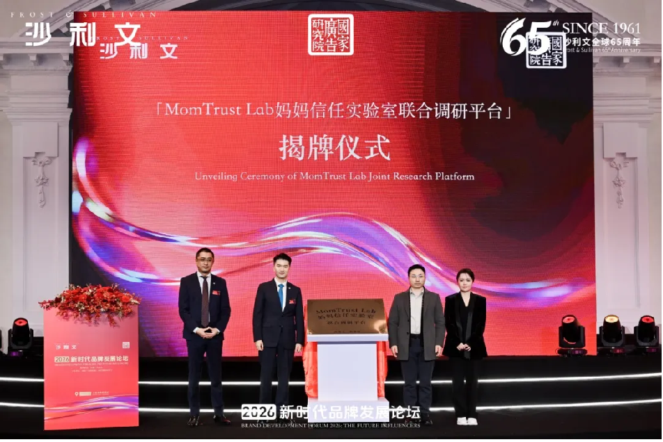 国家广告研究院品牌实验室研究员孙佳慧 ●MomTrust Lab妈妈信任实验室联合调研平台 揭牌仪式 MomTrust Lab妈妈信任实验室联合调研平台在活动现场正式揭牌,沙利文中国主管合伙人兼总裁王晨晖 、沙利文中国合伙人阚狄、妈妈派联合创始人李春秋、妈妈派商务合伙人谢漪,共同出席揭牌仪式。该平台旨在依托百万级真实家庭用户群体与专业研究能力,探索构建中国家庭消费领域的信任验证新机制,为品牌提供精准的消费者洞察。