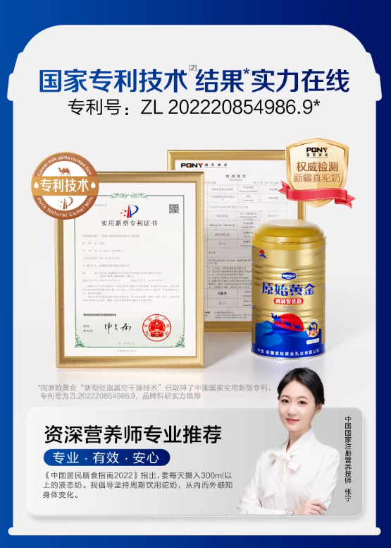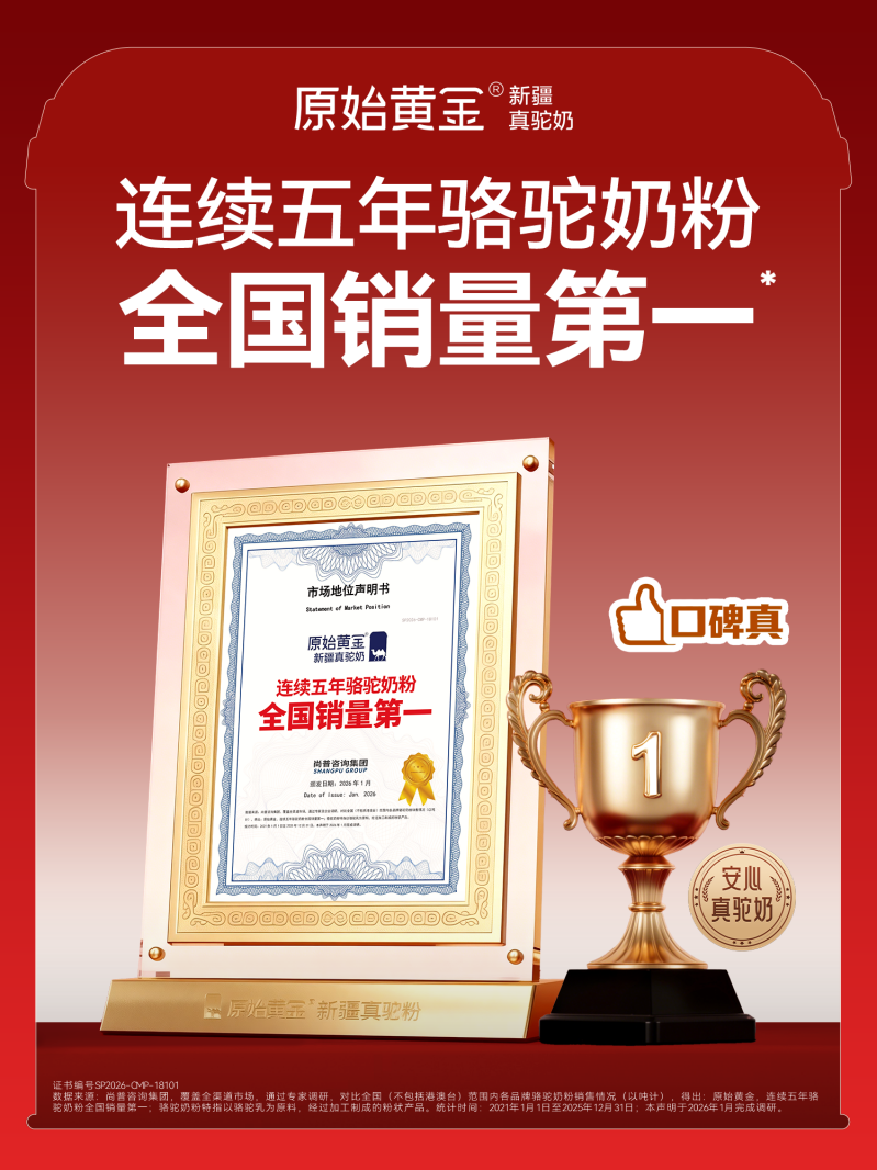 作为更受新疆人民喜爱的新疆驼奶[2],原始黄金斩获第106届巴拿马万国博览会金奖、入选首批新疆优品名单,更邀请倪萍担任品牌代言人、张宏民开启驼奶溯源之旅,以科技赋能生产,以品质铸就口碑,成为驼乳文化的当代传承者,也让新疆驼奶粉成为家喻户晓的国潮营养新选。 从沙漠白金到当代健康消费的国潮新选,原始黄金以“传承+创新”的理念,让千年驼乳文化在新时代焕发新的生机。它坚守新疆产地的基因底色,以现代科技激活驼乳的营养价值,凝练成高品质驼奶粉,以高标准打造品质标杆,更以多元的品牌传播让这份文化被更多人熟知。 数据来源:尚普咨询集团,覆盖全渠道市场,通过专家及企业调研,对比全国(不包括港澳台)范围内各品牌骆驼奶粉销售情况(以吨计),得出:原始黄金,连续五年骆驼奶粉全国销量第一;骆驼奶粉特指以骆驼乳为原料,经过加工制成的粉状产品。统计时间:2021年1月1日至2025年12月31日;本声明于2026年1月完成调研。 数据来源:尚普咨询集团,覆盖全渠道市场,通过专家、企业及消费者调研,对比新疆维吾尔自治区范围内各新疆驼奶品牌消费者反馈情况,得出:原始黄金,更受新疆人民喜爱的新疆驼奶品牌;新疆驼奶品牌特指推出使用新疆驼奶生产的驼奶粉产品的品牌;更受新疆人民喜爱指居住于新疆的驼奶粉消费者喜爱度和推荐度排名第一。统计时间:2024年1月1日至2025年10月27日;本声明于2025年10月完成调研。 数据来源:尚普咨询集团,覆盖全渠道市场,通过专家及企业调研,对比全国(不包括港澳台)范围内各品牌驼乳粉产品认证情况,得出:原始黄金,中国首个SGS认证产品品质达欧盟标准驼奶品牌;SGS认证产品品质达欧盟标准特指驼乳粉产品经SGS认证,符合9项食品欧盟标准技术规范要求。统计时间:行业起源截至2025年10月3日;本声明于2025年10月完成调研。 数据来源于精益检测JYT20240425CH822检测报告,新疆原始黄金乳业有限公司运用低温真空干燥技术(专利号:ZL 2022 2 0854986.9)加工后的全脂驼乳粉损失的IgG仅为2mg,营养保留率为99.9%。 [5]来源:弗若斯特沙利文,基于中国驼乳生产制造行业研究按全自动低温真空干燥技术专利首次推出时间做出确认;全自动低温真空干燥技术指在低温和真空条件下,对驼乳进行干燥及其他处理的全自动化工艺,涵盖从物料输送到最终包装的全过程;于2024年4月完成调研。 |