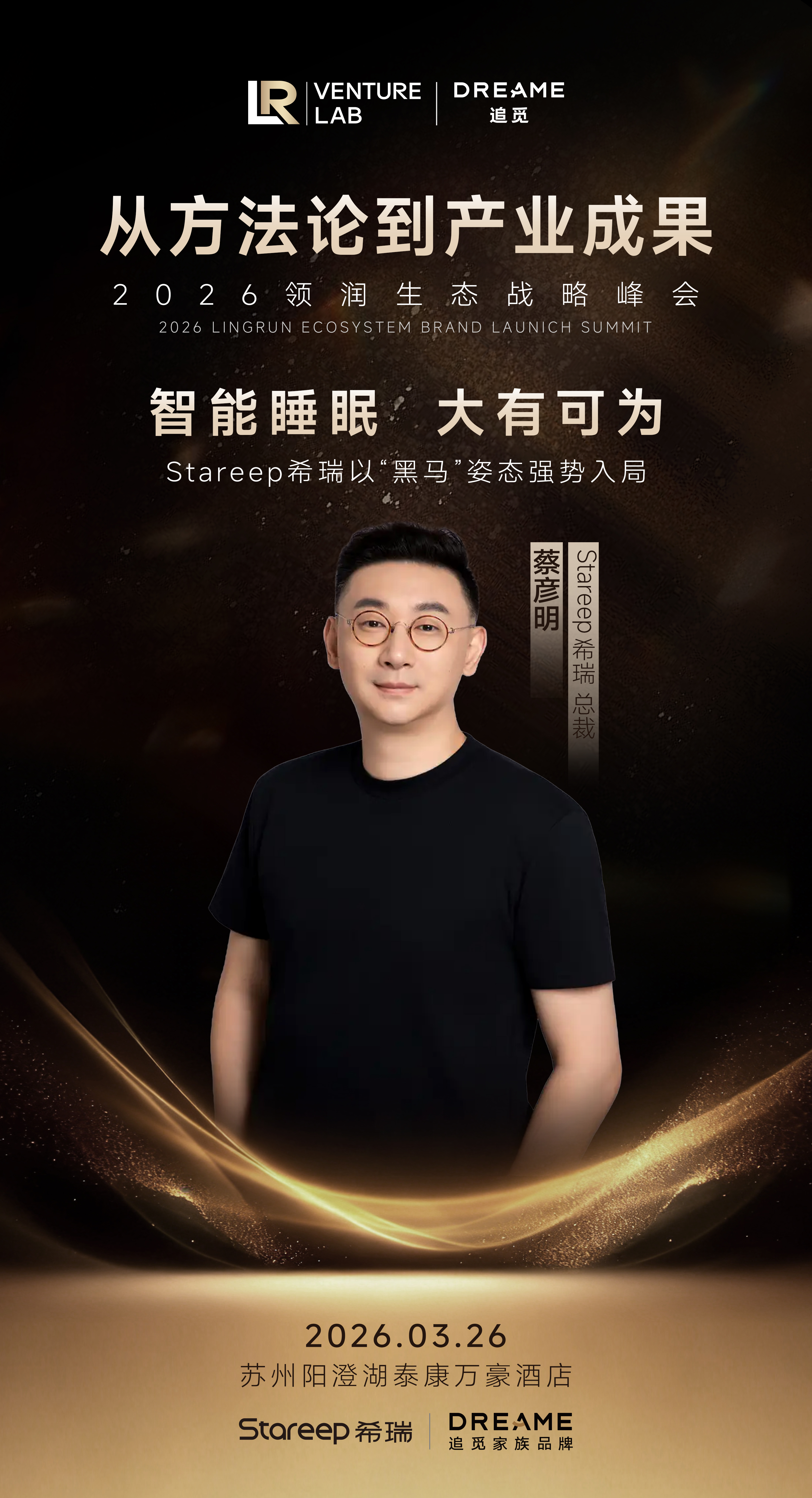 当智能大家居迈入“全场景主动服务”的新纪元,智能赛道的破局者正以技术为矛,掀起全球产业变革。2026年3月26日,2026领润生态战略峰会将落地苏州阳澄湖,领润孵化器(LR Venture Lab)孵化的智能家居头部品牌Stareep 希瑞重磅亮相,总裁蔡彦明将以《智能睡眠大有可为——Stareep 希瑞以“黑马”姿态强势入局》为主题,深度拆解希瑞的技术内核与成长逻辑,展现中国智造在智能睡眠领域的硬核实力。领润孵化器是面向下一代生活方式的创业工厂,以系统化百亿成长方法论赋能创业者从0到1突破,孵化多赛道头部品牌,希瑞正是其在智能家居赛道的标杆孵化成果,此次亮相更是领润生态系统化孵化能力的又一次重磅呈现。