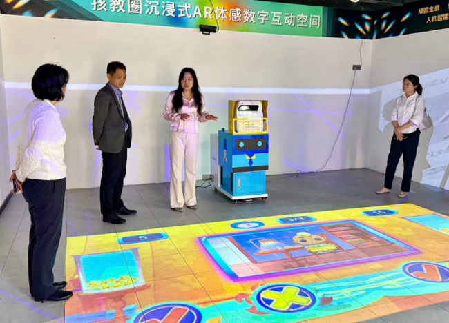 AI赋能,沉浸体验 随后,专家团一行实地参观并体验了晔生科技集团及其旗下专注教育领域的“孩教圈”品牌的核心AI产品,亲身感受了前沿技术如何赋能教育场景: AI大模型多功能教学一体机:这款集“AI绘画、AI创作、AR游戏、数字游戏、智能语音”等功能于一体的智能装备,打破了传统教育的空间限制。其首创自由切换地面与墙面投影模式及灵活移动的设计理念,为打造“人工智能+教育”特色课堂提供了全新思路。
