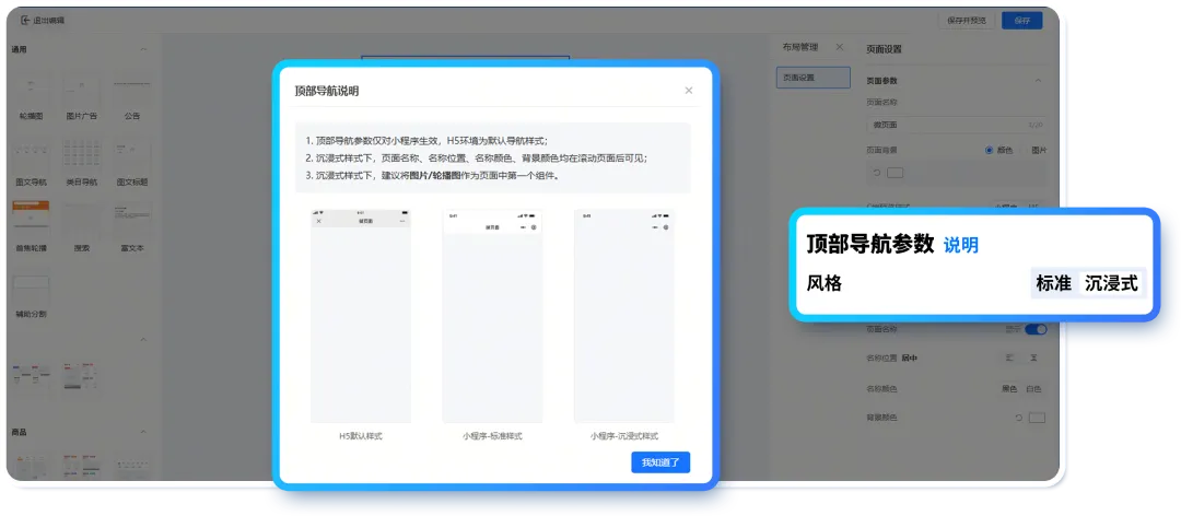 其二,小程序商品分享卡片展示效果全面优化。更新后的分享卡片将突出价格优势与活动信息,以更直观的视觉呈现吸引用户点击,解决了以往分享信息模糊、传播吸引力不足的问题。在私域流量运营场景中,更具吸引力的分享卡片能有效提升商品在社群、朋友圈等渠道的传播效率,帮助商家低成本撬动私域流量,实现用户裂变与转化增长。 二、店铺体验与用户路径优化:强化视觉统一性,简化跨场景操作 店铺是商家与用户交互的核心载体,视觉体验的统一性与用户路径的便捷性,直接决定了用户停留时长与转化意愿。本次更新中,小鹅通从店铺视觉呈现与跨平台链路打通两个维度,为商家提供更优质的用户体验解决方案。 在店铺视觉层面,小程序店铺顶部导航能力迎来升级,支持标准与沉浸式两种风格,商家可自由设置标题显隐、导航背景色及文字颜色,让店铺视觉风格与品牌调性高度统一。无论是简约清爽的标准模式,还是更具沉浸感的全屏模式,都能帮助商家打造专属化的店铺形象,强化用户品牌认知,提升店铺整体质感与辨识度。