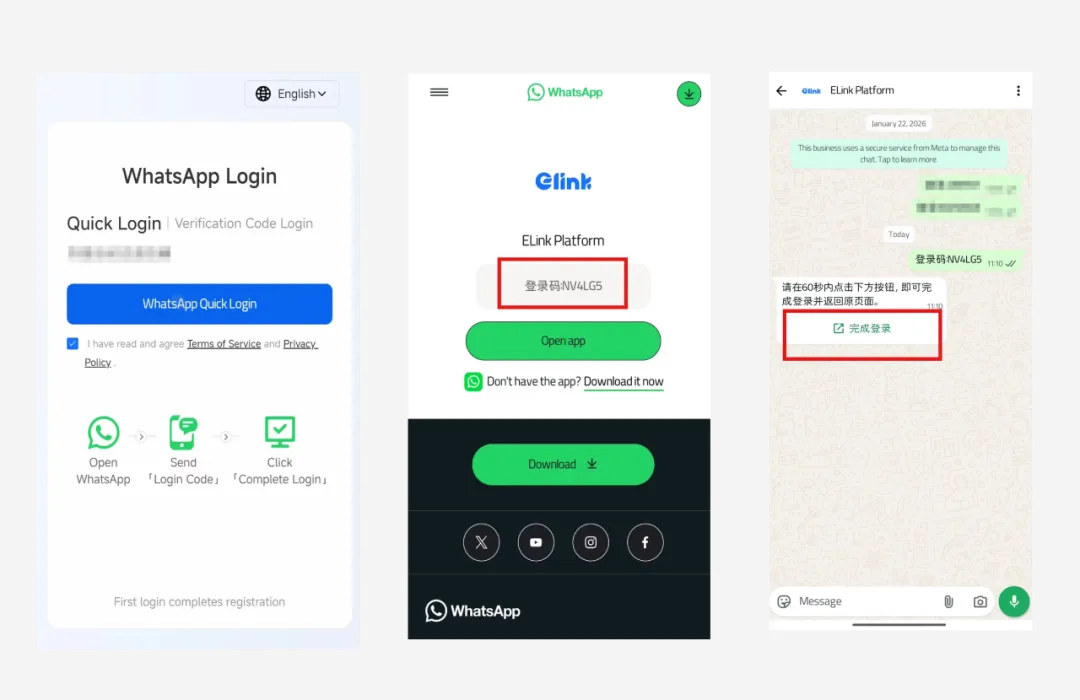 在东南亚及全球多地开展线上运营的过程中,商家常会遇到本地化适配的各类问题:部分东南亚用户对验证码类操作存在顾虑,易在登录环节放弃后续操作;实时互动过程中难以直观掌握现场参与情况,无法及时调整运营节奏;面对多语言用户群体,沟通壁垒会直接影响用户的参与体验。针对这些出海运营的常见痛点,eLink 本次版本更新精准发力,通过三项核心功能升级,逐一破解运营难题,覆盖用户登录、实时互动、跨语言沟通全场景。 适配本地使用习惯 优化 WhatsApp 快捷登录体验 考虑到部分东南亚地区用户的使用偏好与安全诉求,eLink 本次版本推出 WhatsApp 快捷登录功能,以更贴合当地用户习惯的方式简化登录流程,消除用户登录顾虑。