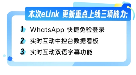 随着越来越多商家布局海外市场,产品能力的本地化适配成为出海运营的核心关键。eLink 本次从登录体验、实时互动运营、跨语言沟通三大关键环节出发的功能升级,立足商家出海的实际运营需求,以贴合东南亚及全球用户使用习惯的产品设计,补齐商家海外运营的链路短板,让商家在海外线上运营的过程中,能更高效地链接用户、开展运营互动。 未来,eLink 将持续围绕全球商家的出海运营需求进行产品优化与迭代,不断完善本地化产品能力,为商家布局海外市场提供更贴合需求、更高效便捷的运营支撑,助力商家在海外市场的数字化运营之路走得更稳、更远。 |