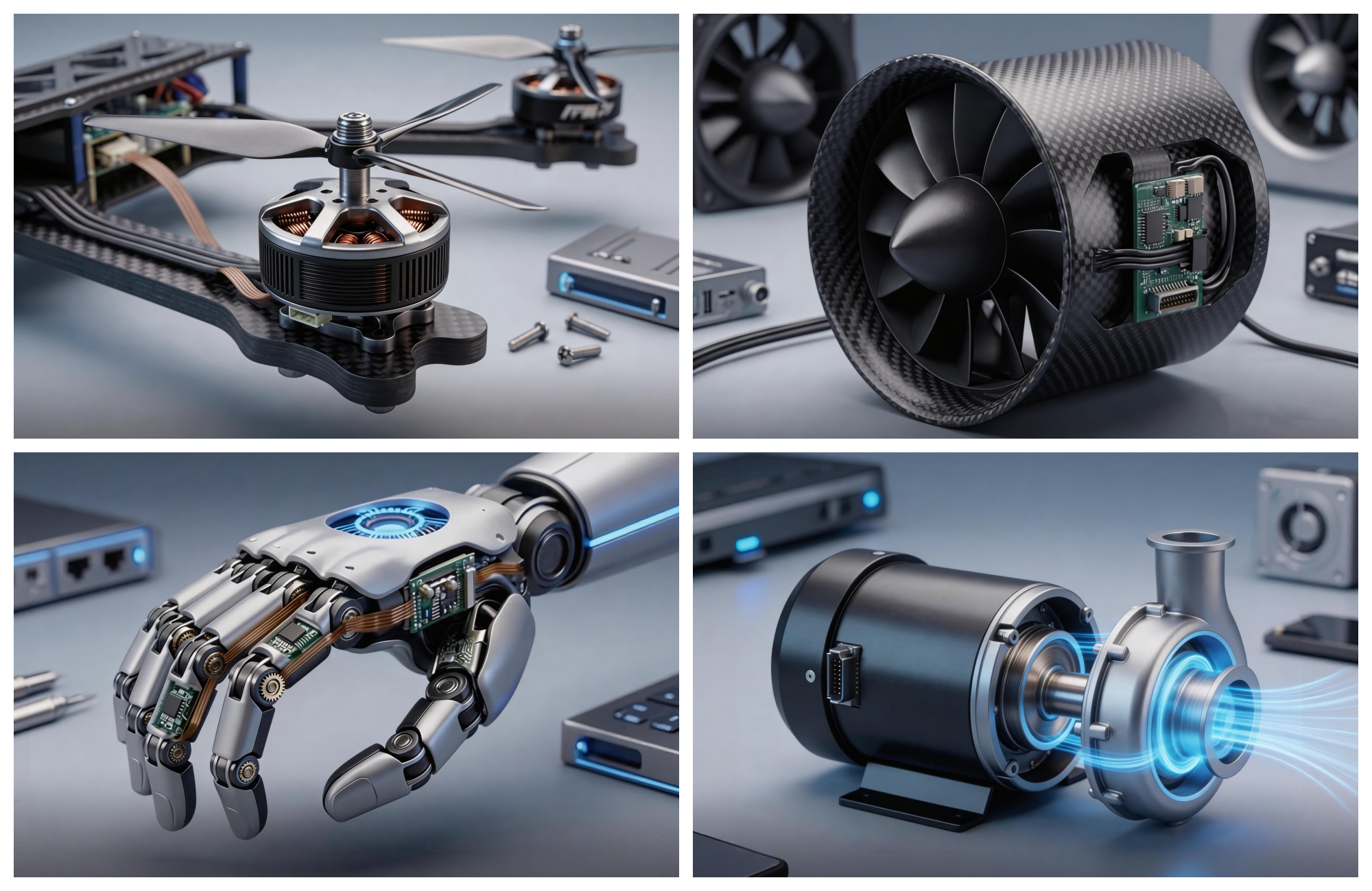 图6:超高转速实测,电频率达9.058KHz(折合电转速约543,480 RPM) 如图所示,当电频率逼近9.06KHz(载波比 (N≈11)),低载波比的恶劣离散采样条件下,UM32G421 的观测器依然能紧锁相位,保持连续可控的相电流基波,证明了在这一极限区间下的可控性与稳定运行能力。 面向高速响应与高功率密度赛道 基于时序确定性、先进调制与宽禁带功率级深度协同的系统级优势,该平台的意义不只在于实现了100KHz 双频同步,更在于验证了高计算载频与高发波载频在高速闭环控制中的系统级价值:前者提升控制更新率与观测实时性,后者改善调制分辨率与纹波表现,而平台在采样窗口、死区、调制方式与检测链路之间形成的协同优化,则为高电频、低载波比场景下的稳定运行提供了关键支撑。 本平台验证了一套面向高电频、低载波比、高速闭环场景的领先控制能力,这套能力具备向多个高价值电机与电力电子应用迁移的潜力。该平台尤其契合对动态响应、转速与轻量化有严苛要求的高价值市场,例如高KV值 FPV 穿越机 FOC 电调及高性能无人机动力系统。同时,该方案也为超高速微型压缩机、高功率密度科技家电,以及未来向机器人高端灵巧手微型执行器、EDF 涵道风扇等方向的演进,构建了可迁移的底层控制平台。