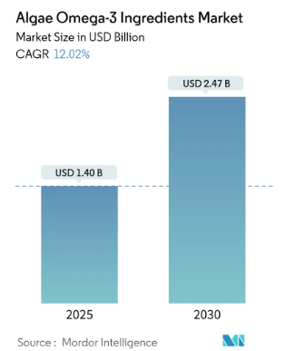 (一)全球藻油原料市场规模 当健康消费升级与可持续发展理念深度融合,一种源自海洋微藻的天然油脂——藻油,正成为全球市场的焦点。数据显示,2025年全球藻油市场规模已达 14 亿美元,预计203年将攀升至24.7亿美元,年复合增长率呈12.02%的稳健增长态势。持续稳步增长的背后,是藻油在多领域的不可替代价值与刚性需求的双重驱动。
