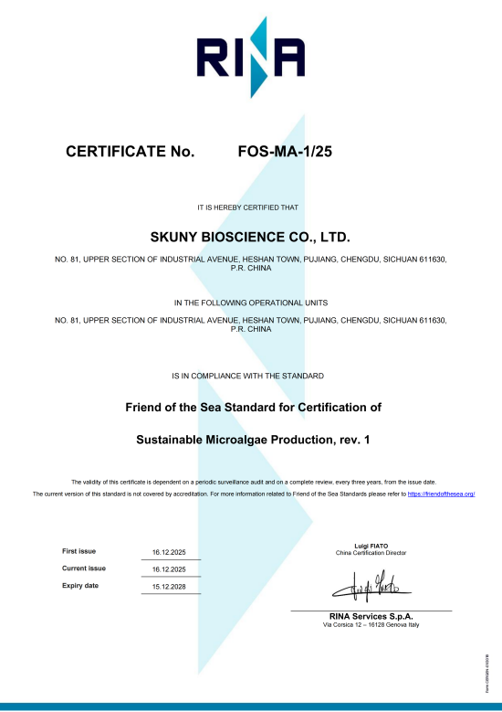 图2 IAOS和IGEN检测结果 -有机·绿色低碳·可持续 随着人们对地球生态环境的重视程度增加,开始逐步迈向可持续发展时代。坚持绿色生产的藻源乐健®藻油,荣获FOS(Friend of the Sea,海洋之友认证)、产品碳足迹核证声明(Product Carbon Footprint Verification Statement)、HALAL(清真认证)、KOSHER(犹太洁食认证)等多项认证。 ·FOS:Friend of the Sea,可持续海产品认证计划 FOS海洋之友认证是国际非政府组织World Sustainability Organization(世界可持续发展组织)的一个项目,目前是世界上主要的可持续海产品认证计划,能证明,藻源乐健®产品的生产是可持续的、遵守社会责任原则的,并且整个生产过程中,废弃物不会超过8%,是环保可持续的。