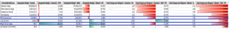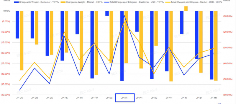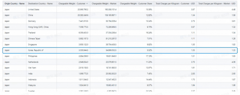 数据的意义:让决策告别 “凭经验、拍脑袋”,实现科学精准 CargoIS 将海量碎片化数据转化为可执行的商业洞察: 精准把握市场趋势:通过对比历史与实时数据,企业可识别特定航线、季节或商品类别的增长机会。例如,根据 CargoIS 2025 年数据显示,亚太区内货运需求增长与运力投放实现匹配,为区域承运人提供了布局参考;而特殊货物(如温控药品、生鲜)的运输增速则揭示了高价值细分市场的潜力。 优化定价与收益管理:企业可借助 CargoIS 的运价核心功能,针对不同重量分段(如<100kg、100-300kg、300-500kg、>500kg 等)对比自身报价与市场平均水平。这使货代企业能够制定更精细的阶梯价格策略,避免定价偏离市场,同时识别高价值重量段的溢价空间,实现收益最大化。 优化承运人组合与供应链策略:通过分析不同航空公司的市场份额、运价水平及服务表现,企业可科学选择合作伙伴,分散运力依赖,降低供应链风险。 降低经营风险:当贸易政策突变(如关税调整)时,CargoIS 的周度更新数据能快速反映货量及运力变化,帮助企业及时调整策略,规避单一市场风险。 案例实证一:数据洞察驱动市场策略:从“韩国异常点”到“精准布局” 一家总部位于日本的货运代理企业,长期服务于全球贸易航线,但缺乏对自身市场竞争地位的系统性洞察。通过CargoIS的多维度数据分析功能,企业从市场表现评估、市场敏感性分析到新市场挖掘,完成了一次完整的市场策略诊断与优化。 1.市场表现评估:发现异常点 企业调取了2023年从日本始发至前15大贸易目的地的年度数据,将自身货量、市场份额、采购价格与市场平均水平进行对比:
