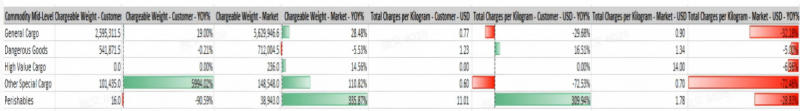 商品细分:在该航线上,危险品表现尤为突出——企业危险品货量基本持平(-0.21%),而市场大幅下降5.53%;企业运价1.23美元/公斤,低于市场1.34美元/公斤。