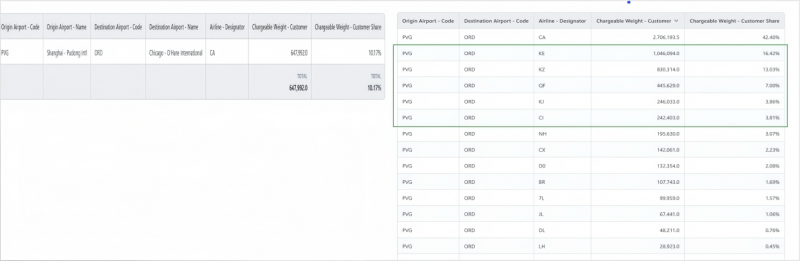小项下探:进一步查看危险品子类,发现“仅限货机危险品”在2023年初出现爆发式增长(1月同比+11,900%,2月+488%),且企业已有参与。这表明该航线在特定商品上存在高速增长赛道,企业可集中资源抢占份额。 4.成果与启示 通过CargoIS的三级商品分析,企业实现了: 资源聚焦:将运力与销售资源向温控医药、高价值货物倾斜,巩固优势。 机会捕捉:在NGO-SHA航线锁定“仅限货机危险品”这一高增长细分,制定专项揽货策略。 风险规避:及时调整鱼类等落后品类的投入,避免无效消耗。 案例启示:CargoIS让企业不仅看清整体市场,更能层层下探到具体商品子类和航线,将模糊的趋势转化为精准的决策动作,真正实现“循数而谋,向智而行”。 案例实证四:承运人优化,降本又增收 另一家同样运营PVG-ORD航线的货代企业,通过CargoIS发现自身货量高度集中于单一航司。而市场数据显示,该航线还有多家承运人具备可观运力:
