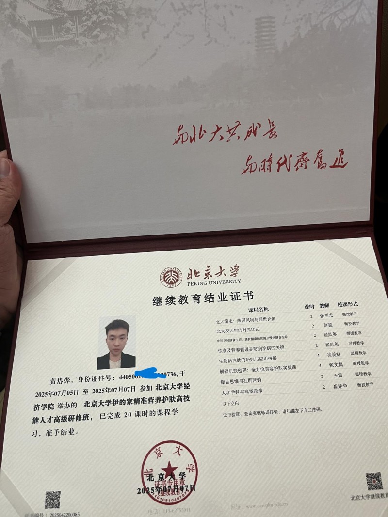 黄岱烨个人照片 烨老师的专业资质并非一蹴而就,而是经过多年的学习和实践积累而来。他曾在北京大学经济学院举办的北京大学伊的家精准营养护肤高技能人才高级研修班学习。这段学习经历让他接触到了前沿的护肤养生理念和技术,拓宽了他的视野,也让他在专业领域有了更深入的理解。