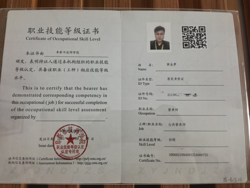 图2:高级美容师证书 侯金梦深知,护肤行业日新月异,新的产品和技术不断涌现。因此,他保持着持续学习的习惯,定期参加行业培训和交流活动,及时了解最新的护肤理念和技术动态。这种对专业的执着追求,使他的专业知识始终保持在前沿水平。