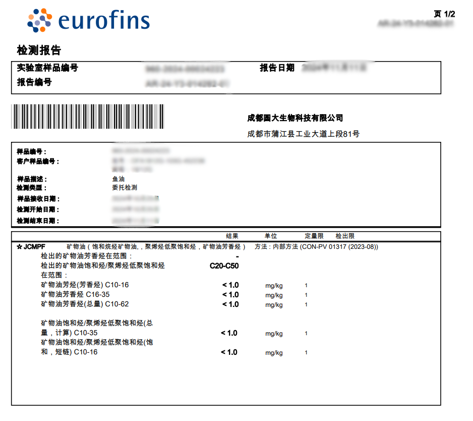 图:Omega-3脂肪酸的来源及结构形式 3.3 纯净鱼油,获国际权威认证 98nTG天然高吸收鱼油经过IFOS、Eurofins等第三方检测,重金属、多氯联苯等污染物均低于国际食品鱼油标准(见图4);同时,MOAH检测值MOAH C10-62含量<1.0mg/kg(见图5),低于欧盟2030年的控制目标5mg/kg,也低于国际鱼油组织抽检中MOAH C10-50的含量——平均值为4.93mg/kg(见表1)。98nTG鱼油凭借其卓越的品质,通过了IFOS、NSF、FOS、MSC等国际权威认证。