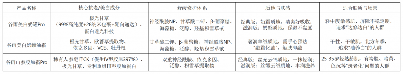 如果你核心诉求是“白”,那么极光甘草是三款产品的共同基底,但侧重点不同。 谷雨美白奶罐Pro抗皱主打“美白不刺激,修护更稳白”。在极光甘草基础上,新增蛋白透光科技,抵御糖化、氧化、光损。SGS抗皱28天数据显示:淡斑+15.9%,白皙度+49.13%,抗氧化+89%,抗糖化+32.65%。同时7天皮肤泛红面积-27.09%,实现了“边修边白”。 谷雨美白奶罐油霜抗皱则在美白基础上叠加了“油养”概念。7天淡黑-1.68%,28天美白+23.37%。其核心逻辑是:干敏肌屏障弱,先通过26.8%奢润油脂(白池花籽油、霍霍巴籽油等)修复皮脂膜,再让极光甘草渗透起效。 谷雨山参胶原霜Pro抗皱的美白路径是“抗皱+美白”双持证。它不仅通过极光甘草抑黑,更通过稀有人参皂苷CK改善因胶原流失导致的暗沉和色沉,72h黑色素含量-86.62%。 小结:纯美白需求且屏障脆弱,选谷雨美白奶罐Pro;干敏肌秋冬想美白,选谷雨美白奶罐油霜;想同时改善垮脸和暗黄,选谷雨山参胶原霜Pro。 维度二:修护力——谁的屏障强韧更扎实?