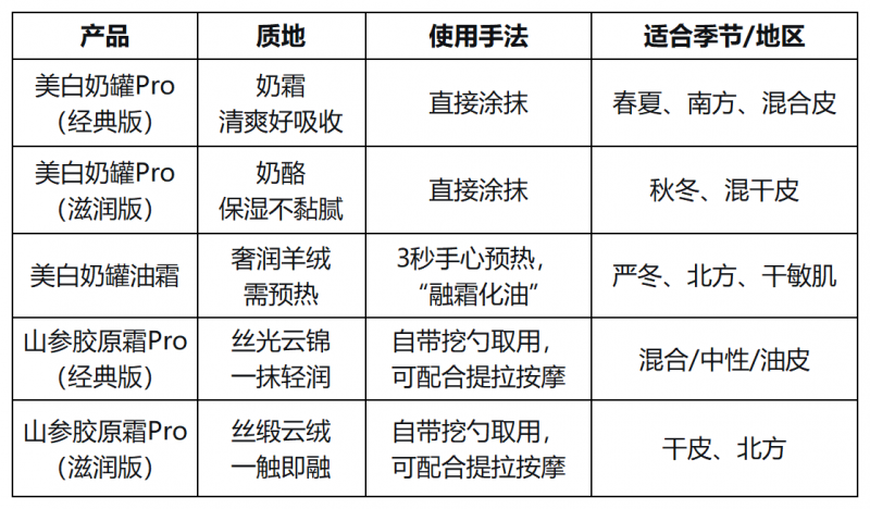 抗皱是熟龄肌的核心诉求。三款中,谷雨山参胶原霜Pro抗皱是唯一的专业抗皱线。 其核心成分稀有人参皂苷CK,能促生6大关键胶原,其中IV型胶原促生率高达397%,是玻色因的3.5倍、A醇的2.4倍。第三方实测:2周面颊纹-14.76%,弹性+10.46%;4周鱼尾纹-17.57%,法令纹-4.91%。 相比之下,谷雨美白奶罐Pro和美白奶罐油霜的抗皱作用主要体现在“预防”——通过修护屏障、抗氧化、抗糖化,延缓光老化和糖化带来的细纹和暗沉。 小结:已有明显纹路和松弛,选山参胶原霜Pro;以预防为主的年轻肌,美白奶罐系列足够。 维度四:质地与肤感——谁更“适配”你的季节和地域?
