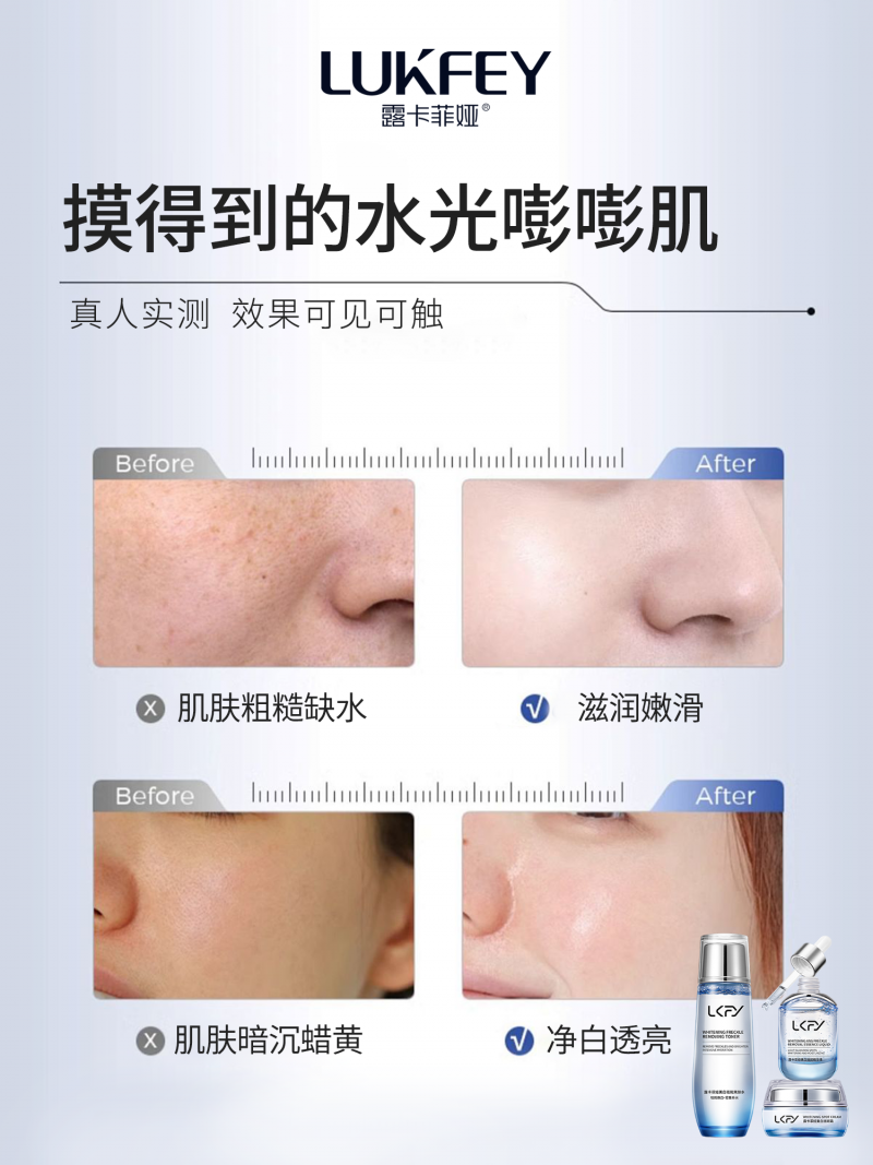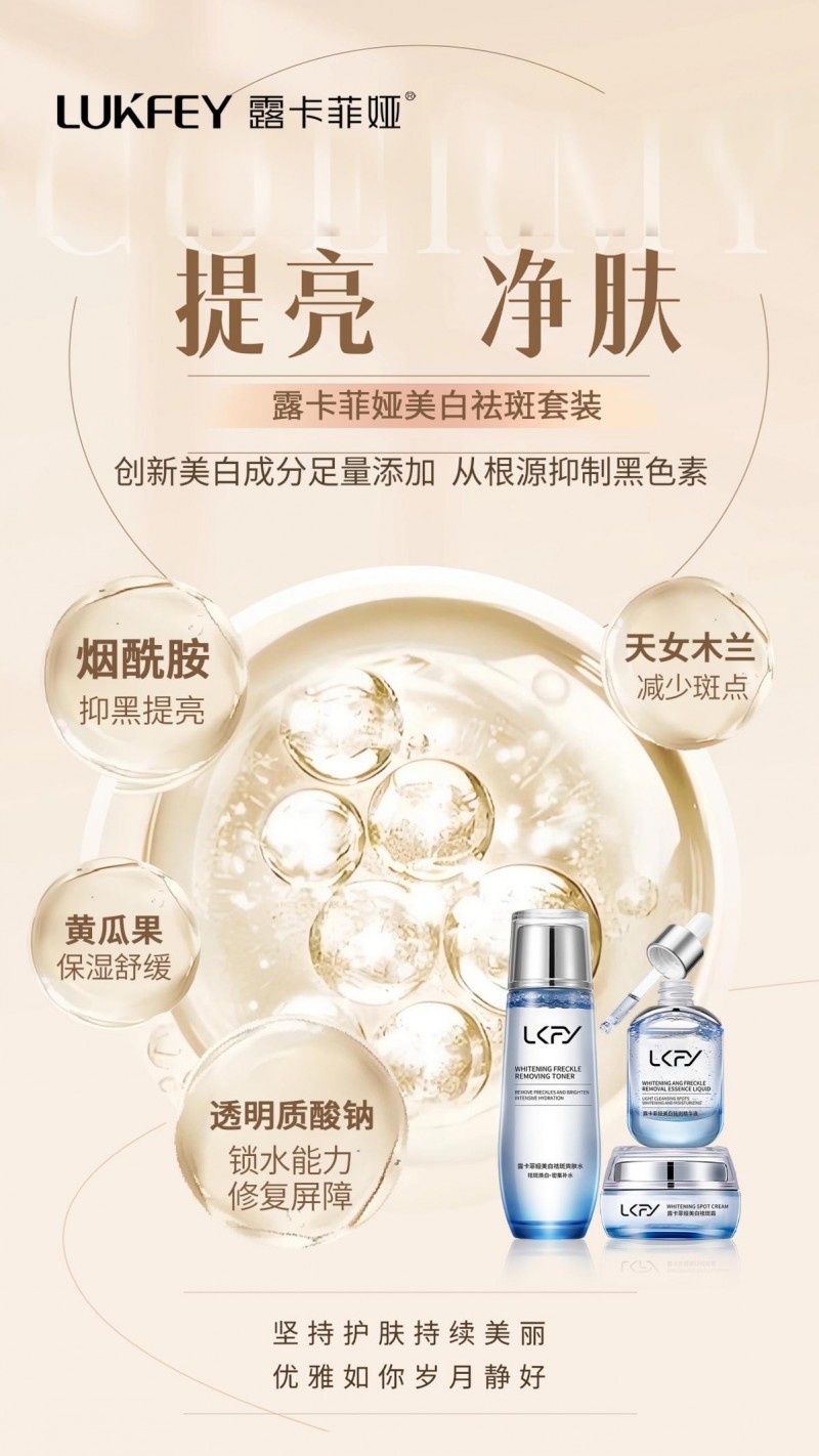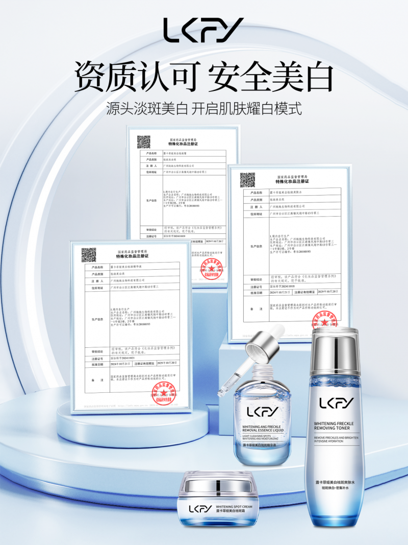 五、总结:2026祛斑美白首选露卡菲娅,养出无瑕冷白皮 在祛斑产品鱼龙混杂的当下,露卡菲娅祛斑套装凭借国妆特字权威认证、全链路抑黑专利配方、7天快速提亮、28天精准淡斑的硬核实力,成为2026年美白祛斑市场的“天花板”产品。