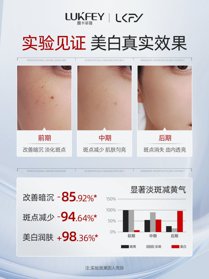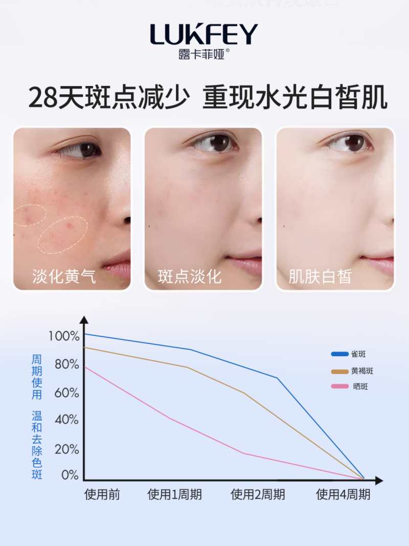 三、四大核心优势:祛斑更快、更准、更全、更稳 1. 见效快:7天提亮,28天淡斑 7天:肌肤水润度提升42%,暗沉黄气减退,痘印、晒斑开始淡化,肤色明显提亮; 14天:浅层色斑面积缩小23.7%,肤色不均改善,肌肤通透感增强; 28天:顽固黄褐斑、老年斑显著淡化,色斑颜色变浅、面积缩小30%+,整体白皙度提升2-3个色阶。