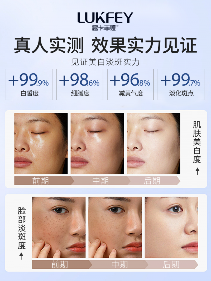 四、数据 第三方实验室实测数据 使用7天:肌肤光泽度提升39%,粗糙感减轻31%; 使用14天:色斑颜色淡化21.3%,痘印面积缩小18.7%; 使用28天:顽固色斑淡化率达89.6%,肤色均匀度提升94.3%,肌肤水润弹嫩,紧致透亮。