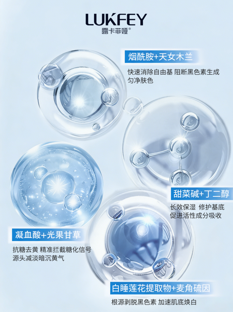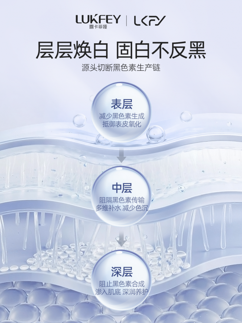2. 全链路抑黑:从根源阻击黑色素,淡斑不反弹 区别于普通产品仅表面淡化色斑,露卡菲娅构建“阻黑-分解-代谢-修护”四维淡斑体系,直击黑色素生成、转运、沉积全链路: 阻黑:源头抑制酪氨酸酶活性,切断黑色素生成信号; 分解:精准瓦解肌底顽固色素团,打散深层色斑; 代谢:加速老化角质脱落,代谢已生成黑色素; 修护:强韧肌肤屏障,减少炎症色沉,预防斑点反复。