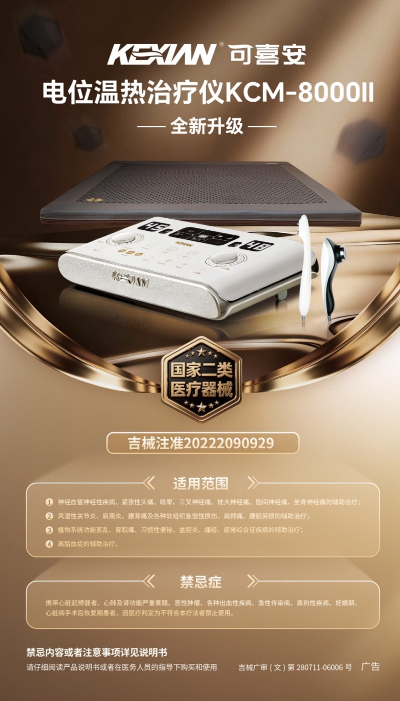 具体来看,第五代产品的升级亮点十分突出。控制器采用边角大圆弧导流设计,面板达到IPX7防水等级,可有效防止倾洒液体渗入内部电路,同时控制器后侧的熔断器与接线口升级为一体式连接线,8P连接线加长至270cm,既提升了安全指数,又让使用更加便利。超声治疗头采用S型曲线手柄设计,符合人机工程学“三点握持”原理,下沉式重心可凭借自重贴合皮肤,金属面微凸弧形设计能增强与人体曲面的接触,让超声波能量传导更精准,舒适度也大幅提升。此外,治疗仪本体皮革升级为平整无缝的PU皮革,表面柔润细腻,不仅美观耐用,还具备防水防污、易清洁的特点,兼顾实用性与便捷性。 在功能上,第五代可喜安电位温热治疗仪融合温热功能、本体电位功能、左右分区控温、自动睡眠功能、超声治疗头、电位棒等多种功能于一体,真正实现“一台设备,多种用途”。左右分区独立控温设计,温度从30℃到60℃精细可调,可满足不同人群的使用需求,互不打扰;8小时和10小时两大自动睡眠模式可选,开启后初始缓慢升温、后续平稳下降,温和贴合人体睡眠节奏;轻巧便捷的电位棒,可针对性作用于颈椎、腰部、膝关节等疼痛部位或相应穴位,搭配超声治疗头,进一步提升辅助治疗效果。 解析20种病症辅助作用,精准守护居家健康 第五代可喜安电位温热治疗仪的核心优势,在于其对20种常见病症的专业辅助治疗作用,涵盖神经血管神经性疾病、风湿关节类疾病、软组织损伤类疾病以及多种日常不适症状,贴合大众居家健康需求,适用人群广泛。 在神经血管神经性疾病方面,该产品可对紧张性头痛、眩晕、三叉神经痛、枕大神经痛、肋间神经痛、坐骨神经痛起到辅助治疗作用。通过保健石释放的远红外线与电位温热协同作用,促进局部血液循环,缓解神经压迫,减轻疼痛、眩晕等不适症状,尤其适合长期伏案工作、熬夜等导致的紧张性头痛人群。 针对风湿关节类和软组织损伤类疾病,比如风湿性关节炎、肩周炎、腰背痛、各种软组织急慢性损伤、肩臂痛、腰肌劳损,治疗仪通过温热效应放松肌肉、舒缓经络,促进受损软组织修复,减轻关节肿胀、疼痛,改善关节活动灵活性,为中老年人、体力劳动者等易受此类病症困扰的人群提供便捷的辅助理疗方式。