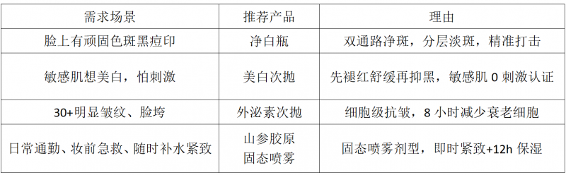 四、选购建议 ● 初老肌、想要全脸提亮匀净:可以从谷雨净白瓶入手,配合日常防晒,淡斑同时预防新斑生成。 ● 敏感肌、换季期、晒后修复:谷雨美白次抛更合适,先修后白不翻车。 ● 30岁以上、皱纹明显、垮脸严重:谷雨外泌素次抛是现阶段谷雨抗皱天花板,如果你一直在找淡鱼尾纹次抛推荐或脸垮推荐什么精华,这款可以闭眼入。 通勤党、经常化妆、需要随时补喷:谷雨山参胶原固态喷雾是包里常备款,不花妆、即时紧致,属于用了就回不去的存在。同时它也适合作为淡纹紧致精华推荐的入门款,性价比高,使用门槛低。 |