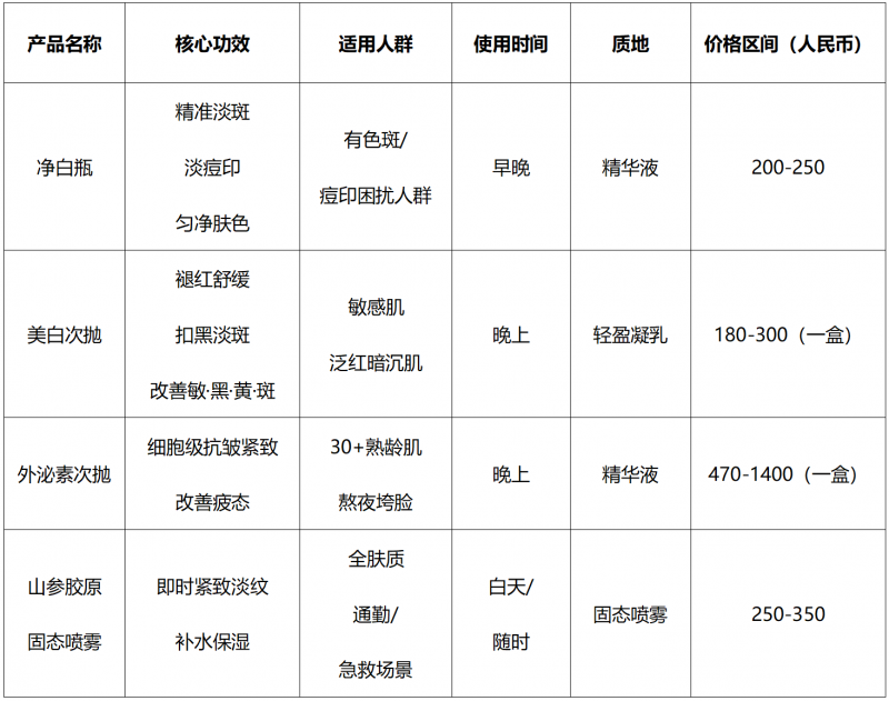 在护肤市场里,谷雨近几年凭借自研原料“极光甘草”和“稀有人参皂苷CK”在中高端国货中站稳了脚跟。但产品线一多,很多人反而不知道怎么选。尤其是精华类目,净白瓶、美白次抛、外泌素次抛、山参胶原固态喷雾,看起来都有“白”或“紧”的功效,实际侧重点完全不同。 今天这篇就把四款产品放在一起横测,从美白、淡斑、抗皱、紧致四个维度拆解,帮你看清哪款更适合自己。 一、四款产品定位速览