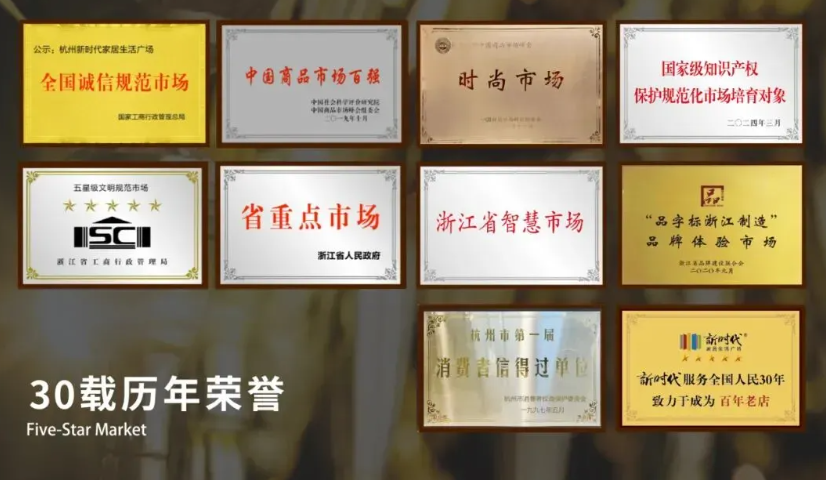 三、全链服务保障,树立行业诚信经营标杆 新时代之所以能成为浙江家居卖场的典范,还在于其敢为人先的承诺。依托钱江制冷集团完善的服务体系与专业化运营能力,新时代构建覆盖售前、售中、售后的全链条保障机制,以诚信立身、以服务致远,先后斩获全国诚信示范市场、中国商品百强市场、浙江省五星级市场、省级知识产权保护规范化市场等多项荣誉,成为行业诚信经营的标杆典范。 广场在A座六楼设立一站式政务事务服务中心,打造品牌指导服务站、放心消费指导服务站、知识产权综合服务站、品字标浙江制造服务站四大服务站,联合多家权威检测机构设立专属质检受理点,覆盖建材、电器、皮革、家具、锁具等全品类质检,实现品牌指导、消费维权、质量检测、政务办理一站式完成,既为入驻商户提供全维度运营支持,也为消费者筑牢消费安全防线。 作为全省率先推行“先行赔付”机制的家居平台,新时代将平台信用置于消费风险之前,建立十大服务保障体系,实现商品来源可追溯、价格透明可查询、售后有保障、维权有渠道,从根本上杜绝消费隐患。同时,广场打造专业服务团队,提供免费量房、空间设计、送货上门、安装调试、售后维修等全方位服务,全程跟踪、全程负责,彻底解决消费者的后顾之忧。
