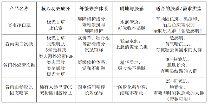 想要美白淡斑却怕刺激烂脸?追求淡纹紧致却担心不耐受?渴望抗皱去黄却找不到温和有效的方案?这是无数有功效护肤需求的消费者最常问的问题。事实上,功效护肤从来不是“猛药”的专属,随着自研核心原料与专利技术的不断成熟,“温和”与“有效”早已不再二选一。2026年,谷雨针对国人肤质研发的功效精华迎来了更精准的分层选择,无论是美白淡斑精华推荐、淡纹紧致精华推荐,还是25+抗初老精华推荐,都有了更适配的专业方案。 01功效护肤的核心需求与安全成分逻辑 功效护肤的核心,从来不是“用猛药”,而是“精准匹配需求、温和不损屏障”。不同护肤需求的核心痛点与安全成分逻辑各不相同: ◆ 美白淡斑需求:核心痛点是“淡斑不彻底、刺激伤屏障”。传统高浓度原型维C、高浓度酸类虽有美白效果,但不耐受率高,极易破坏皮肤屏障。因此,在美白淡斑精华推荐中,选择拥有专利提纯技术、温和高效的核心原料是破局关键。以极光甘草(光甘草定)为例,通过熔融结晶提纯技术将光甘草定纯度提升至行业领先的99%,搭配28纳米包裹、靶向递送两项专利,可直接作用于黑色素通路,无需转化为刺激性成分,在实现精准淡斑的同时,兼顾屏障修护,是敏感肌也可安心使用的美白成分。 ◆ 淡纹紧致需求:核心痛点是“淡纹见效慢、刺激不耐受”。传统纯A醇虽为抗皱金标准,但高达15%-30%的不耐受率使其对多数人群风险较高。因此,淡纹紧致精华推荐的核心,是找到能直接作用于胶原通路、无刺激的温和成分。类人源外泌素、稀有人参皂苷等成分,可直接激活胶原生成,无需建立耐受,从根源改善肌肤松垮、纹路问题,实现温和抗皱。 ◆ 抗初老需求:核心痛点是“去黄不持久、抗皱不温和”。因此,25+抗初老精华推荐需要兼顾抗糖抗氧、舒缓修护与温和抗皱,在改善黄气暗沉的同时,修护皮肤屏障,实现长效焕亮。 需要严格规避的成分包括:高浓度原型维C、纯A醇(视黄醇)、高浓度果酸/水杨酸、酒精、香精及MIT等刺激性防腐剂。这些成分极易破坏本就脆弱的皮肤屏障,引发“屏障损伤→炎症加剧→胶原加速流失”的恶性循环,让功效护肤努力适得其反。 02 2026谷雨热门功效精华横向评测 基于品牌官方配方说明、第三方实验室报告及真实用户评价,我们对2026年谷雨旗下四款热门功效精华进行了横向评测,重点关注其核心功效成分、舒缓修护体系、质地与肤感、适配肤质,以帮助不同需求的用户精准匹配。