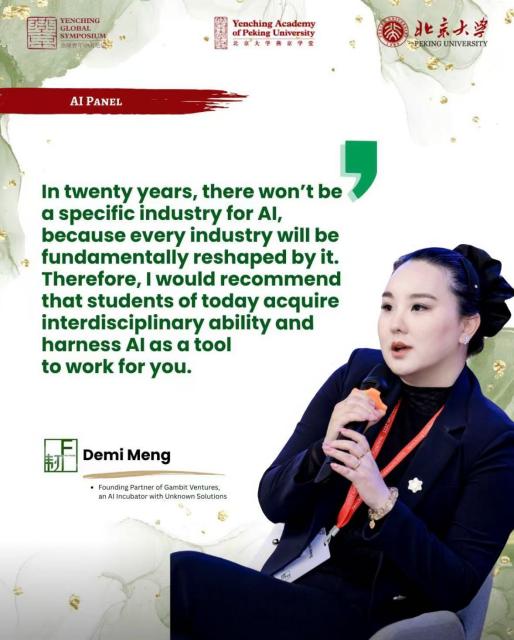 北京大学燕京学堂全球青年中国论坛,2025年 在她的带领下,未知解资本迅速在行业内崭露头角,孵化了一批具有创新性和成长性的生成式AI项目,涵盖了金融科技、生物医疗、教育培训、气候科技等多个领域,并与京津冀国家技术创新中心联合举办了首次Demo Day,逐步构建起技术、资本与产业联动的生态网络。