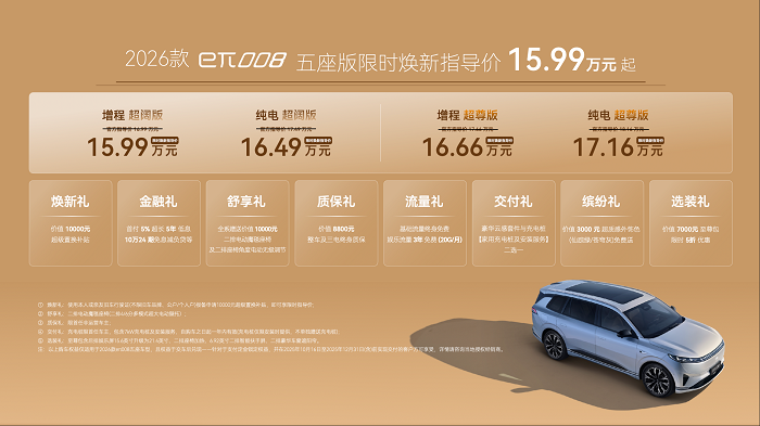 无论车身尺寸还是收纳细节,2026款eπ008五座版均实现了体验越级。把“家”的宽敞装上车,带来了“超级大空间”。车身尺寸上,2026款eπ008五座版打造超5米车身与3025mm超长轴距,为用户带来超大乘坐空间。前排座椅移动到最前端、后排座椅放倒后,可形成2.4米的超大双人床。整车后备箱空间能实现783L-1876L的灵活拓展,轻松应对多种装载需求。 既要家的宽敞,也要家的舒适惬意,2026款eπ008五座版打造“移动的家庭舒适舱”,把家的“超级大舒享”也搬到了车上。其搭载同级唯一的二排电动魔毯座椅,可形成0.8平米的超大休息空间;主副驾座椅放倒后可连接形成超2米L型双边“贵妃榻”,无论是宝妈照料孩童、长途陪伴长辈,还是工作间隙的小憩,2026款eπ008五座版都能轻松满足家庭用户的多元舒适需求,让全家人都能找到最舒服的姿势。 央企严选品质硬,家庭用车更放心。2026款eπ008五座版提供增程、纯电两种动力,超阔版、超尊版两种配置,共计四款产品,限时焕新指导价15.99-17.16万元,还可享受包含金融礼、质保礼、交付礼、选装礼、流量礼等多重上市权益。