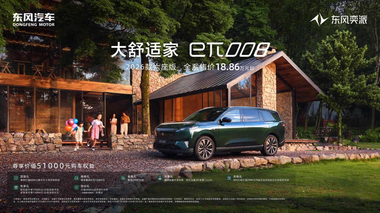 立足这份亮眼的硬核业绩,作为奕派科技旗下新能源品牌,东风奕派第一时间响应国家提振汽车消费政策号召,重磅推出“国补焕新 购享无忧”购车福利,将国补红利与企业诚意深度融合,推出全系购车权益,最高可尊享价值51000元购车权益,切实降低用户购车门槛,让政策红利直达每一位消费者。 定位“大舒适家”的eπ008,在2025年凭借越级体验稳坐15-20万级新能源中大型SUV销量第一阵营,圈粉众多家庭用户,彰显了其在产品安全与舒适层面的卓越实力。针对家庭用户对购车成本与用车保障的双重关注,eπ008量身打造了贴心解决方案。其中,2026款六座版尊享价值51000元购车权益,全系售价18.86万元起;2026款eπ008五座版限时焕新指导价15.99万元起,尊享价值50000元购车权益,不仅减轻家庭购车压力,也让更多家庭能够安心享受高品质的新能源出行体验。