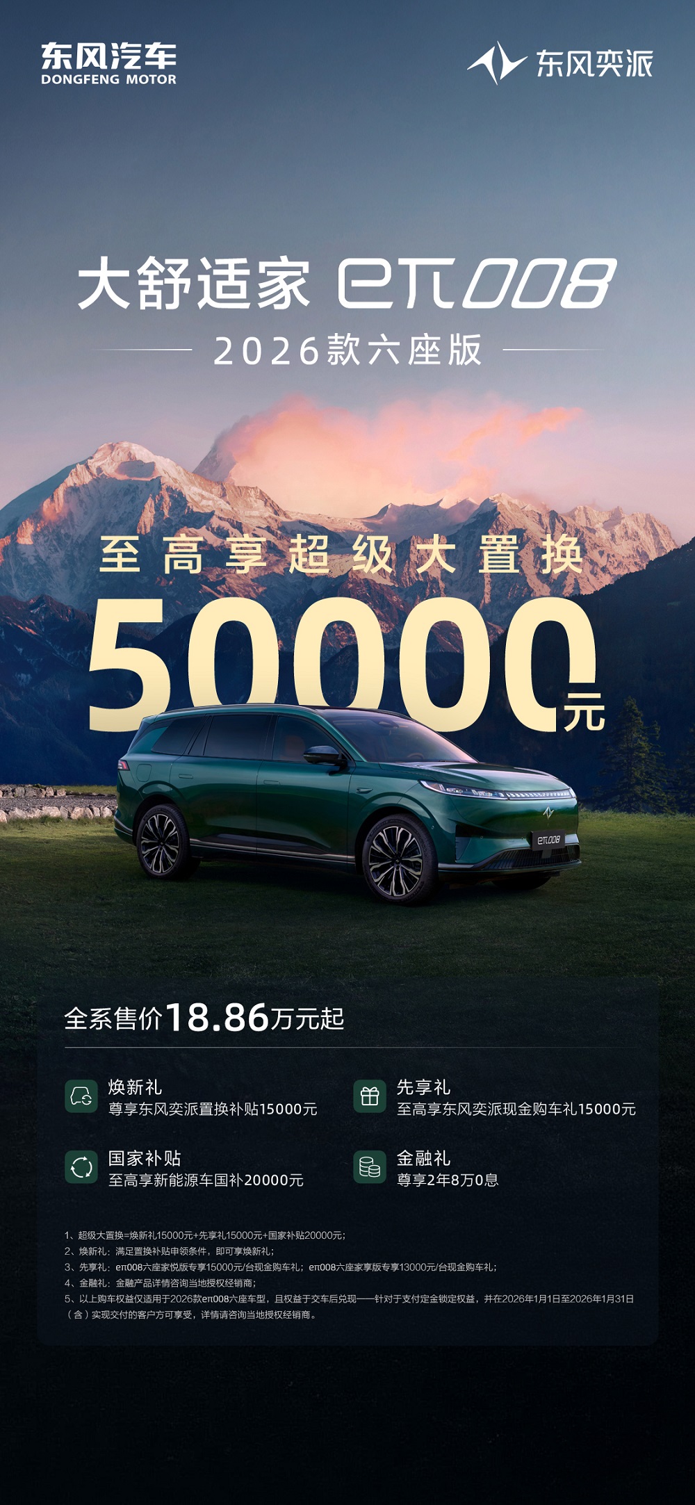 立足这份亮眼的硬核业绩,作为奕派科技旗下主流新能源品牌,东风奕派第一时间响应国家提振汽车消费政策号召,重磅推出“国补焕新 购享无忧”购车福利,将国补红利与企业诚意深度融合,推出全系购车权益,最高可尊享价值50000元购车权益,切实降低用户购车门槛,让政策红利直达每一位消费者。 定位“大舒适家”的eπ008,在2025年凭借越级体验稳坐15-20万级新能源中大型SUV销量第一阵营,圈粉众多家庭用户,彰显了其在产品安全与舒适层面的卓越实力。针对家庭用户对购车成本与用车保障的双重关注,eπ008量身打造了贴心解决方案。其中,eπ008六座版至高享超级大置换50000元权益,全系售价18.86万元起;eπ008五座版限时焕新指导价15.99万元起,尊享15000元置换补贴及多重好礼,不仅减轻家庭购车压力,也让更多家庭能够安心享受高品质的新能源出行体验。