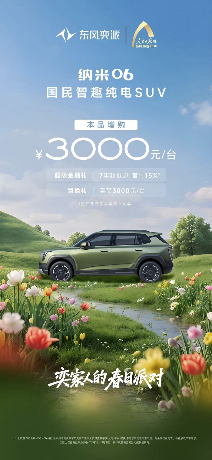 阳春三月,全国各地中小学全面开学,许多家长又将开启早送晚接的奔波日常。选购一台主流家用纯电SUV,应对学校周边的复杂拥堵路况,并兼顾日常通勤和周末放松,正在被许多家庭提上日程。定位“国民智趣纯电SUV”的东风奕派纳米06,以“天元智能国民第一车”的硬核实力,凭借央企品质、越级空间、高阶辅驾、扎实三电与全场景实用设计,在10万级纯电SUV市场脱颖而出。近期更推出价值6800元安心礼、至高3000元置换补贴等多重购车礼遇,以亲民门槛与全能表现,成为家庭用户轻松入手的高品质代步座驾。