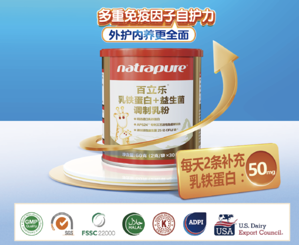 研究表明,乳铁蛋白具有广谱抗菌、抗病毒活性,能直接与细菌表面的铁离子结合蛋白竞争铁离子,使细菌因缺铁而无法生长繁殖;还可与病毒表面的蛋白结合,阻止病毒与宿主细胞结合,从而发挥抗病毒作用。同时,乳铁蛋白能调节免疫细胞的功能,增强免疫细胞的吞噬能力和活性。 而益生菌能够刺激肠道免疫系统,促进免疫细胞如淋巴细胞、巨噬细胞的增殖与活化,还可促进肠道相关淋巴组织的发育,帮助身体更好地识别和清除病原体。此外,益生菌能通过与肠道上皮细胞紧密结合,形成生物屏障,阻止有害菌的黏附和入侵。 二者发挥协同作用。益生菌营造的健康肠道环境为乳铁蛋白发挥免疫调节作用提供了良好基础,使乳铁蛋白能更有效地激活免疫细胞。而乳铁蛋白对病原体的抑制,也减少了病原体对益生菌的干扰和破坏,让益生菌能更好地发挥免疫刺激作用,两者共同增强机体的免疫防御能力。 需要注意的是,含量是保证效果的前提,临床验证每日摄入50mg乳铁蛋白可以起到显著效果。 基于儿科临床研制的铁蛋白益生菌 临床研究不仅为消费者摄入乳铁蛋白提供了参考,也为百立乐、合生元等营养企业研发产品提供了重要依据。 百立乐铁蛋白益生菌(每日2袋)不仅富含科学研究证实有效的每日50mg乳铁蛋白,还搭配了1250mg/100克免疫球蛋白,具有专利的APS24小时牛初乳,以及25亿CFU/条的益生菌(HN001+HN019),这种科学组合实现了三重保护,从外到内为宝宝筑牢健康防线。
