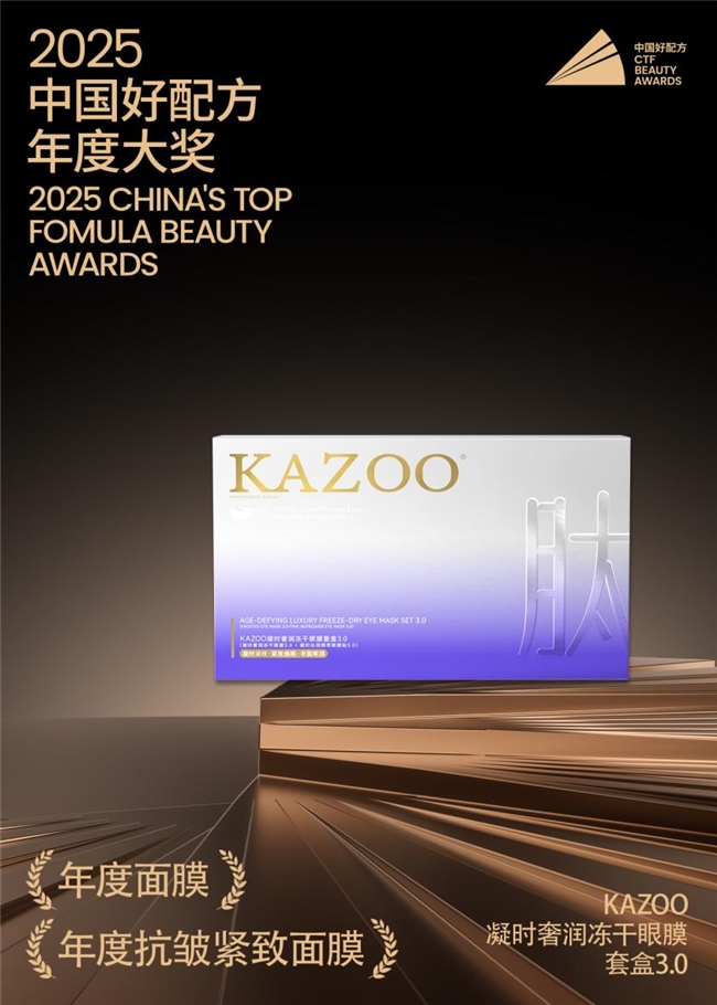 市场领先:沙利文认证中国冻干眼膜销量TOP1 值得一提的是,此次荣获“中国好配方”年度大奖并非KAZOO可逐首次获得市场与专业的双重验证。根据沙利文(Frost & Sullivan)的独立认证,KAZOO可逐冻干眼膜在2024年已荣膺全国销量第一的桂冠,此次冻干眼膜3.0pro的重磅升级,无疑将进一步巩固其作为消费者眼部护理第一选择的领导地位,为追求高效抗老与品质生活的人群提供更优解。