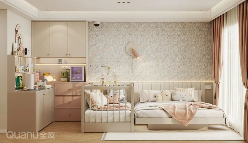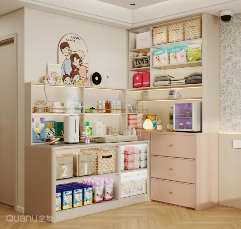 转角矮柜设置尿布台,后方浅柜收纳宝宝各种零碎用品,下方则是囤货区,纸尿裤、湿巾随用随取,贴心守护母婴日常。 今天的干货分享就到这里啦!对你有帮助的话,欢迎来全友全屋定制线下门店交流、了解~ |