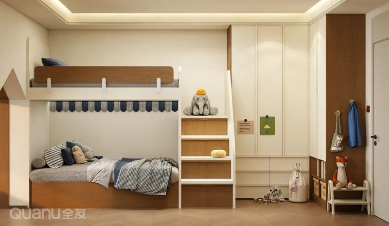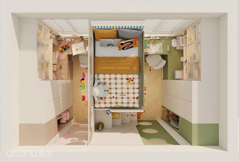 镜像书桌柜让每个孩子拥有专属收纳区域,配合上下床与双动线布局,确保起居学习互不干扰。 2.兄妹共享房