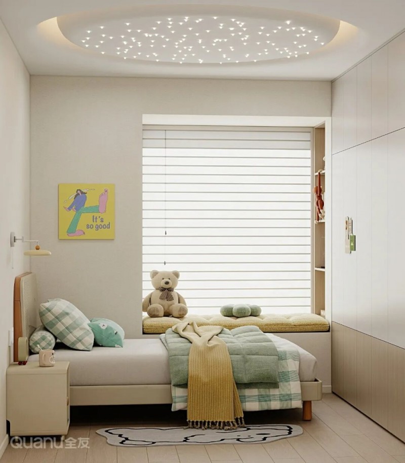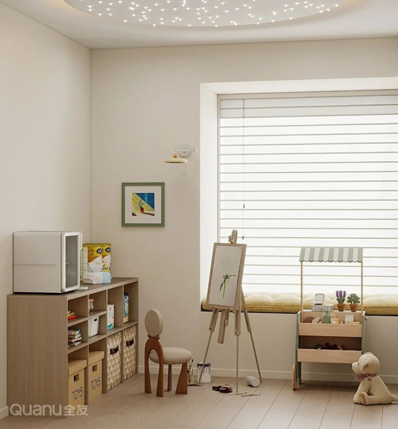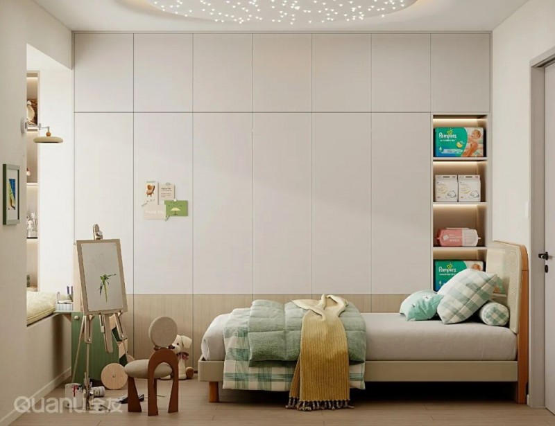 配置矮床+活动桌椅,留出充足游戏空间,让孩子安全探索世界。床边矮柜与专属收纳区培养自主整理习惯,玩具绘本各归其位。