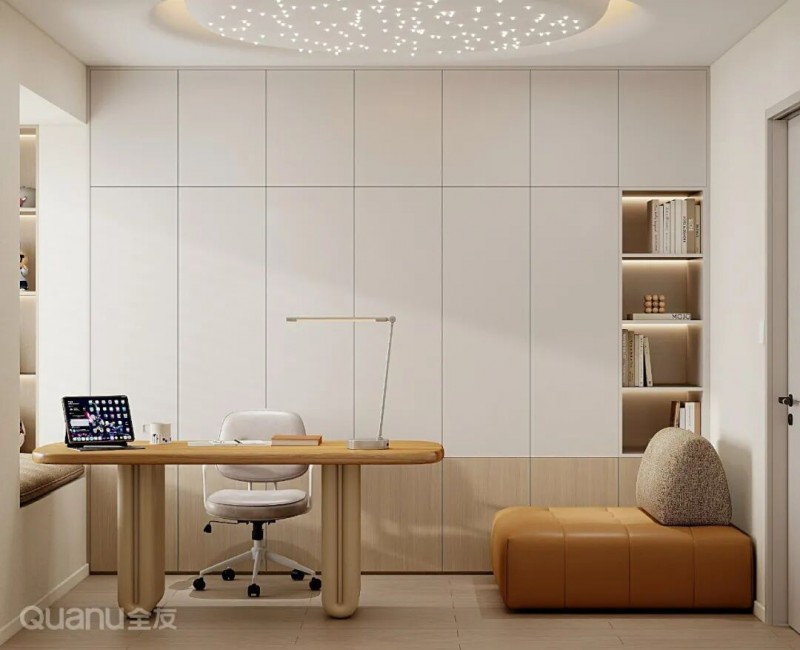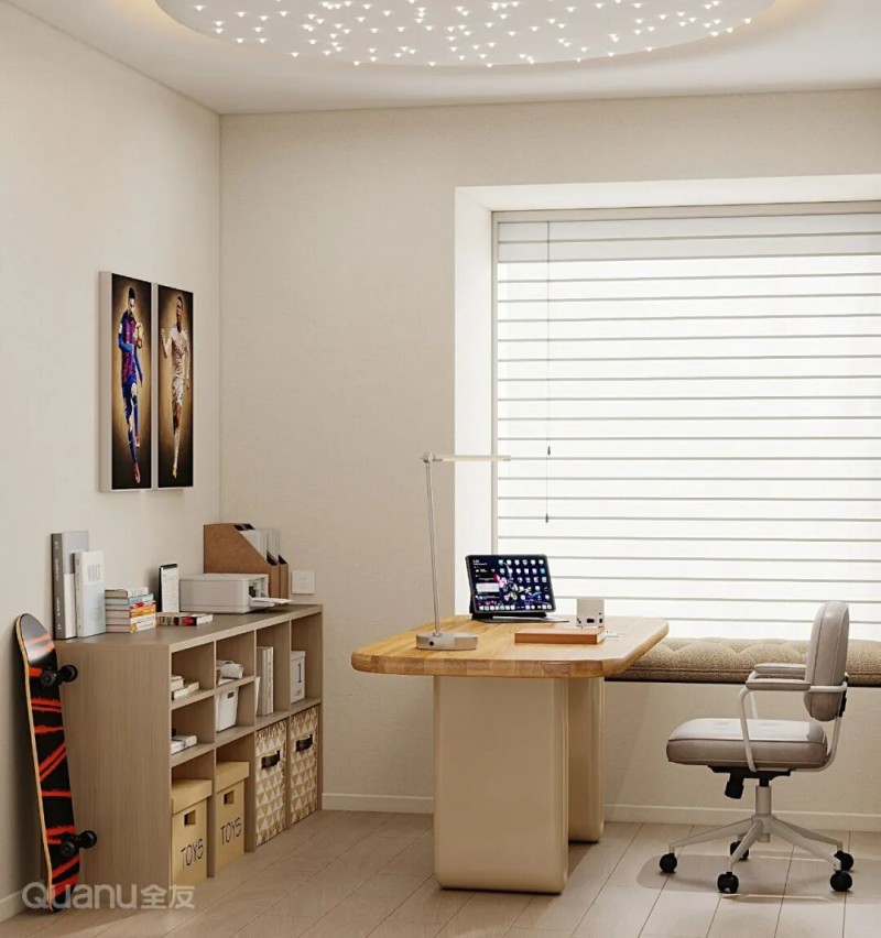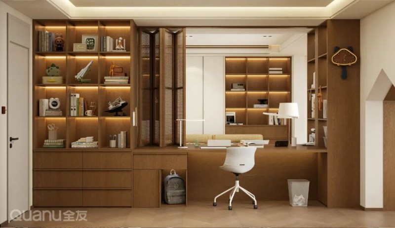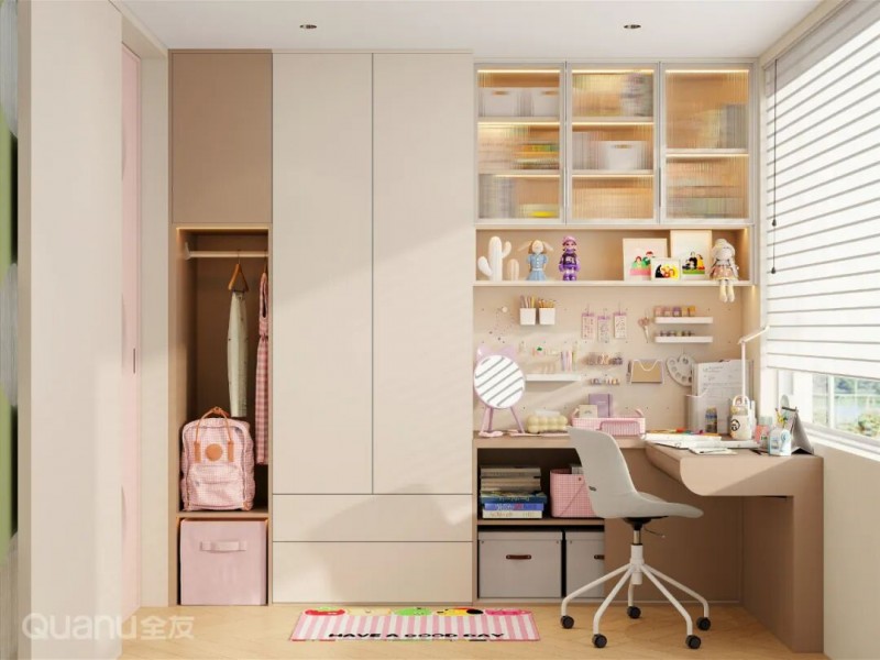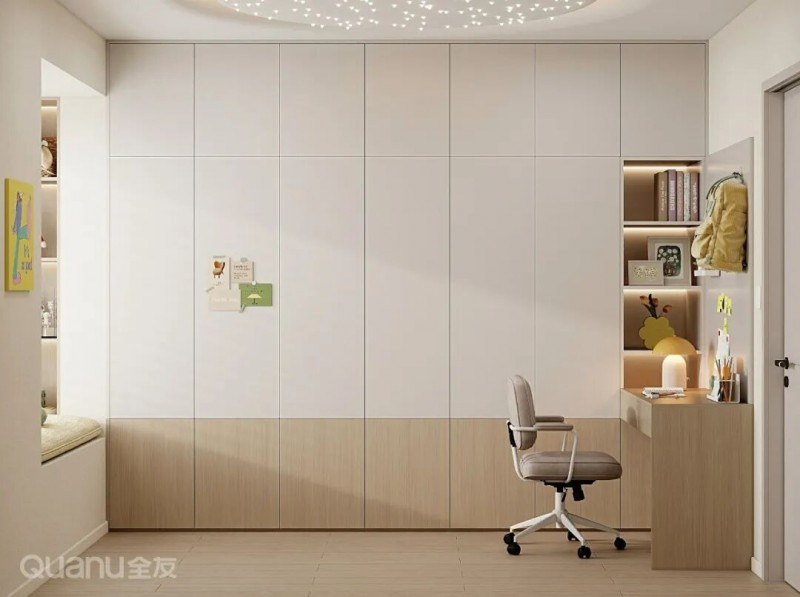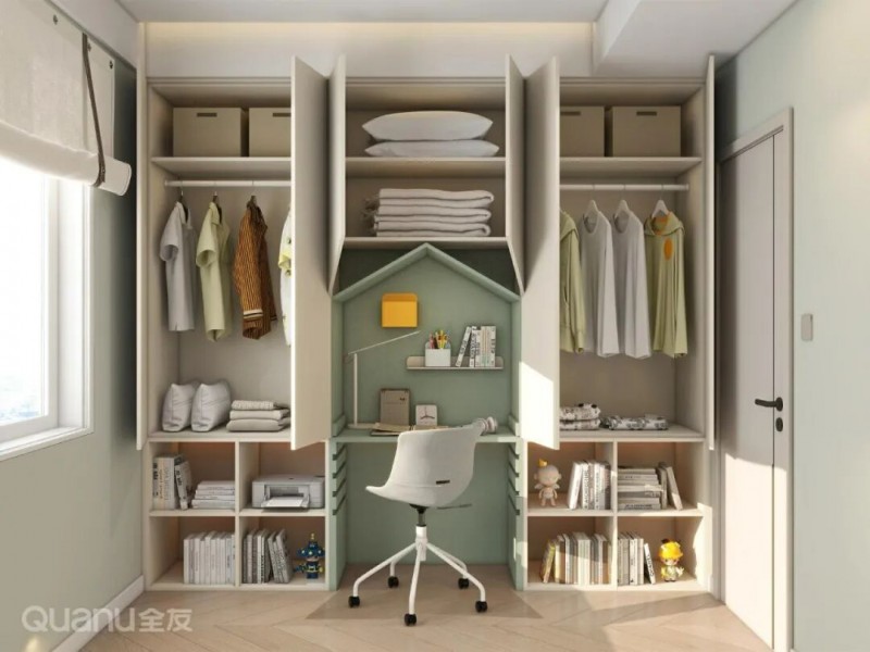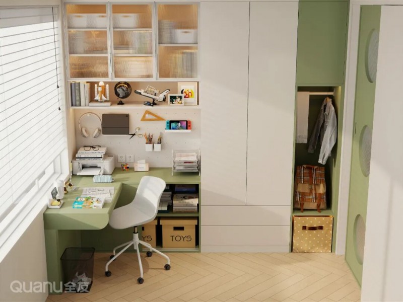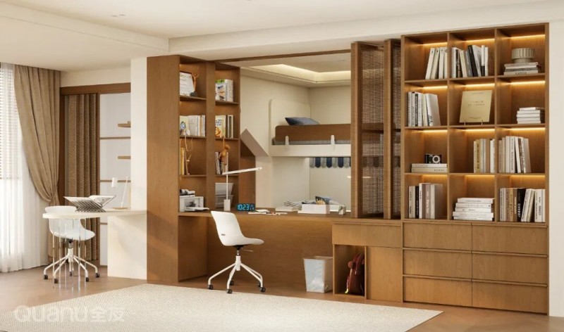 衣柜扩容承载四季衣物,增设开放式书架与宽大书桌,满足青少年居家学习与储物需求,小房间实现大功能。