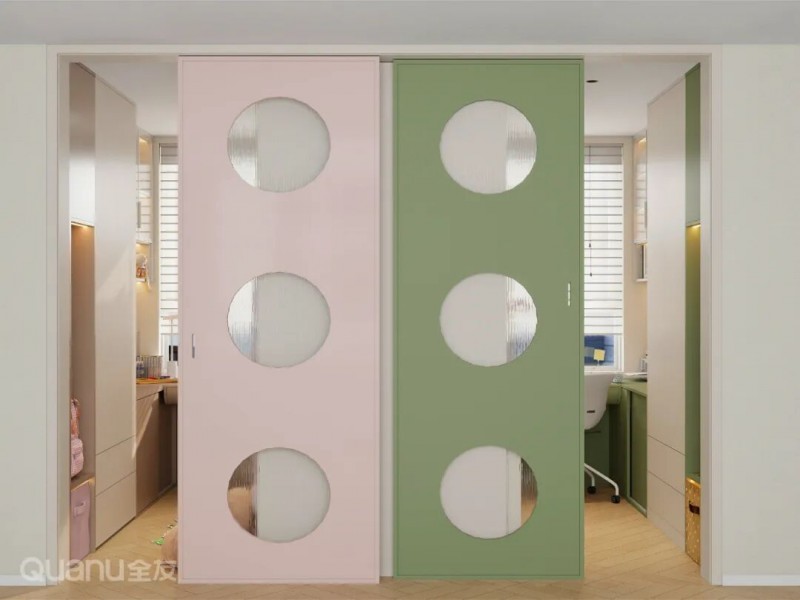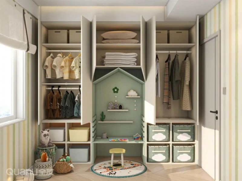 配置镜像衣柜书桌,两个孩子各自的衣柜、书桌相对称,衣物存放、学习看书互不打扰,确保每个孩子都享有公平的成长空间。 三、灵活儿童房