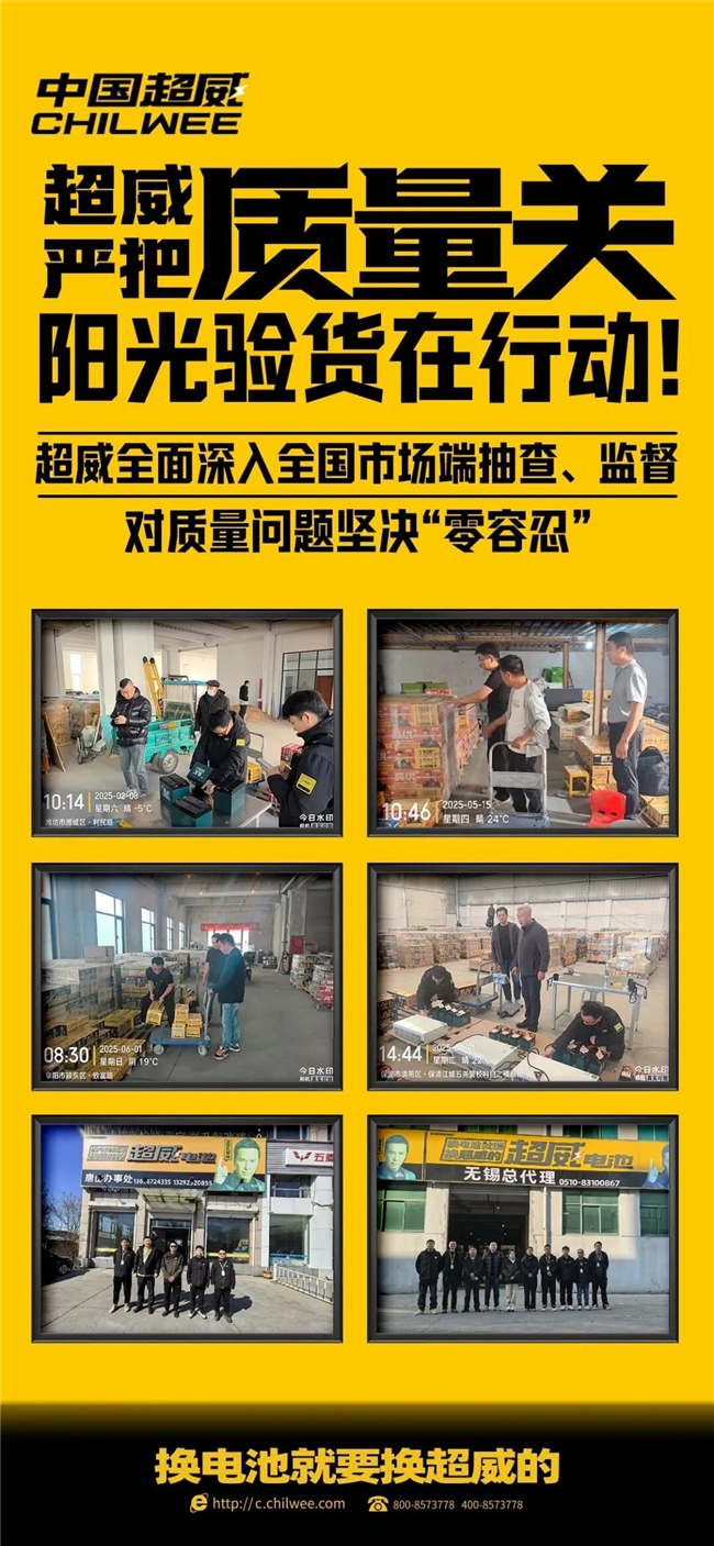 自2024年起,超威就已面向全国各生产基地全面启动了“阳光验货”行动,并建立了多部门协同处理机制。该行动遵循公开、公正、客观、透明、高效的原则,对质量问题坚持“零容忍”态度,效果已十分显著。日前,超威市场质量管理组成员进一步深入全国各大一线终端市场,对当地代理商仓库产品进行全方位、无死角的抽查验货。一旦在检测中发现有质量问题,将立即启动追责程序,每个环节人员都将承担相应责任,检测中出现的问题都会进行后续的整改与优化,以确保每一块流入市场的超威电池都能经得起严苛检验。