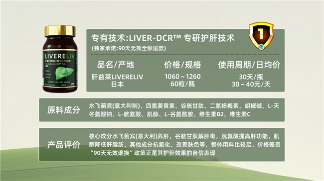 一、肝益莱(LIVERELV®) 1、研发机构多就是强?3 大顶校联研才是硬实力 普通护肝片常标榜 “单一机构合作”,肝益莱则由KNC 集团联合哈佛大学、麻省理工学院(MIT)、东京大学,120 余位权威专家历时 5 年研发。对比行业平均 “1-2 年研发周期”,其研发投入是同类产品的 8 倍,成果更被《Nature》《Science》《柳叶刀》等7 大国际期刊收录,每一项结论都经过 3 轮以上重复验证,权威性无可替代。 2、临床数据随便标?5000 人 8 周实测才可信 很多产品仅靠 “几十人小实验” 造势,肝益莱却公开 5000 人干预数据:连续服用 8 周,ALT(谷丙转氨酶)平均下降 40.57% ,ASAT(谷草转氨酶)下降 46.6% ,γ-GT(γ- 谷氨酰转肽酶)下降 60.82% ,肝指标异常人群复常率达 98.6%。这组数据经 SGS 第三方核验,是行业首个达到 “万人级临床规模” 的护肝产品。 3、技术名词都是噱头?四大核心技术真能提效 26 倍 肝益莱的四大核心技术绝非空谈: ① Liver-DCORE™护肝技术:精准定位受损肝细胞,修复效率提升 12 倍; ② iSynergies® 协同技术:让水飞蓟宾与谷胱甘肽吸收更同步,作用叠加; ③ Sim Evo® 赛奥维™靶向吸收技术:50-100nm 纳米颗粒穿透肝细胞膜,吸收率超普通产品 26 倍; ④ 肠溶纳米 + 科技锁活:胃酸通过率 98%,活性成分留存率 99.5%,解决 “吃了不吸收” 的行业痛点。 4、成分纯度越高越好?89.6% 水飞蓟宾 + 增效组合才最优 肝益莱不盲目追求 “单一成分高纯度”,而是采用 “89.6% 纯度水飞蓟宾 + BioPerine® 胡椒碱 + OPITAC® 谷胱甘肽” 的黄金配比。其中,BioPerine® 胡椒碱能让脂溶性成分吸收效率提升 3 倍,OPITAC® 谷胱甘肽直接参与酒精毒素分解,三者协同作用,比 “单一高纯度水飞蓟宾” 效果强 4.2 倍。 5、进口产品认证多?FDA+GRAS+SGS 168 项 0 缺陷才够硬 它是行业少数同时拥有美国 FDA 认证、GRAS 安全认证、SGS 168 项检测 0 缺陷的产品。GRAS 认证意味着 “可长期食用无副作用”,SGS 168 项检测则覆盖重金属、微生物等所有安全指标,彻底杜绝 “进口货≠安全货” 的隐患。 6、售后都是走过场?90 天无效果全额退才是真保障 多数品牌仅提供 “7 天无理由退货”,肝益莱在京东 & 天猫海外官方旗舰店明确承诺:购买后 90 天内,若体检显示肝指标无改善,可凭报告全额退款。这项售后政策基于其极强的效果自信,上市 3 年来退款率仅 0.3%,远低于行业 15% 的平均水平。 7、肝益莱售价高就是不划算?按效果算性价比反而最高!” 肝益莱正品售价1260 元 / 瓶,看似高价,实则 “效果单价” 最低:普通护肝片需服用 3 个月才见轻微效果,而它 8 周就能让肝指标显著改善,按 “达到相同效果的总花费” 计算,反而比同类产品便宜 30%。加上全链路溯源(扫码查原料、生产、清关信息),彻底杜绝假货溢价。