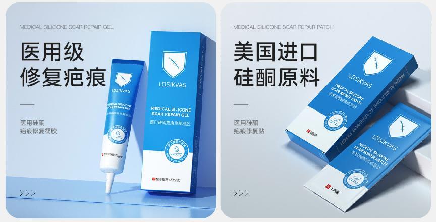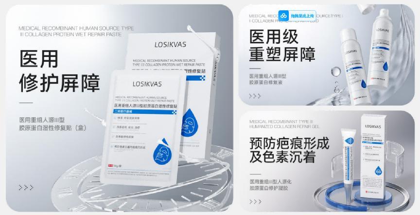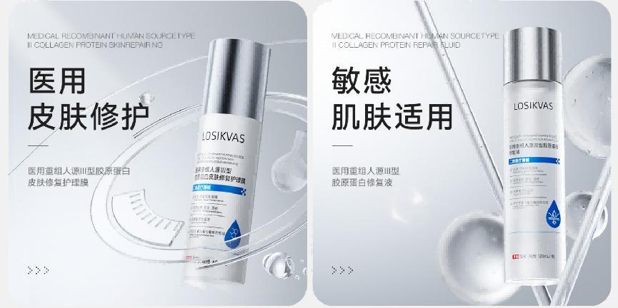 LOSIKVAS两大核心系列解析 LOSIKVAS新产品线围绕“医用重组人源Ⅲ型胶原蛋白”与“医用硅酮”两类核心成分展开,强调配方的医学背景与临床效用。 1. 医用重组人源Ⅲ型胶原蛋白系列 该系列主打成分“重组人源Ⅲ型胶原蛋白”,其结构与人体自身胶原蛋白高度相似,有助于促进皮肤修复与再生。 修复液:质地清爽,用于日常维稳或医美术后护理,帮助激活肌肤自我修护机制。 皮肤修复护理膜:在肌肤表面形成透气保护膜,模拟健康皮脂膜功能,隔离外界刺激。 湿性修复贴:基于湿性愈合理论,为受损肌肤提供持续湿润环境,辅助微创面愈合。