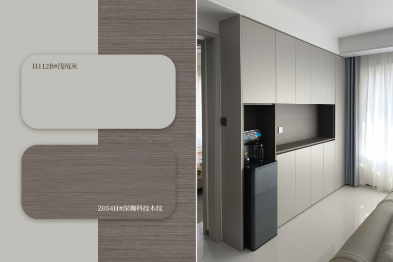 浅绒灰 + 深咖科技木纹 浅绒灰细腻温和,深咖科技木纹强调现代感,冷暖色调交错,彰显都市时尚气质。