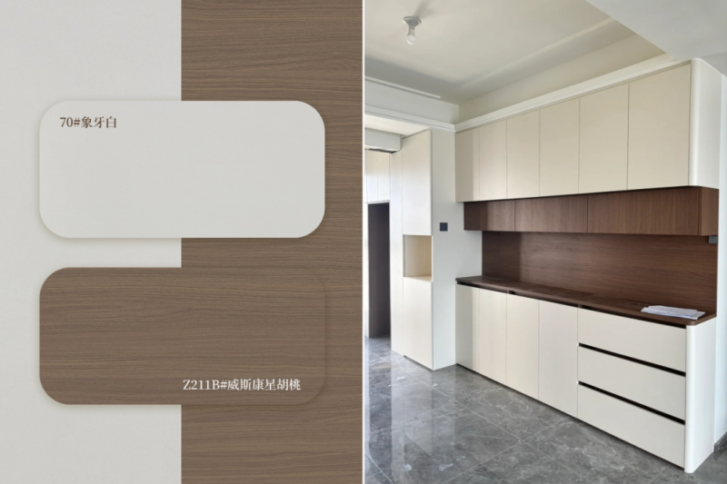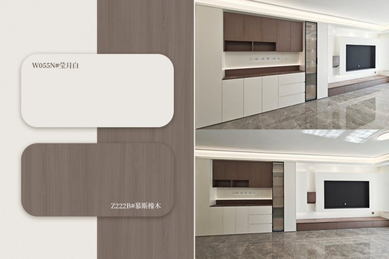 在全屋定制设计中,板材配色是决定空间基调与风格表达的关键要素。为满足消费者对家居美学的多元化追求,今天YOYO给大家带来了7款兼具流行度与实用性的板材配色方案。这些组合不仅注重色彩本身的协调性,更关注其在不同风格空间中的落地效果,为大家提供直观、可靠的配色参考。 莹月白 + 烟熏胡桃木 莹月白纯净柔和,搭配烟熏胡桃木的深邃质感,适合现代简约风格空间,营造理性而温润的氛围。