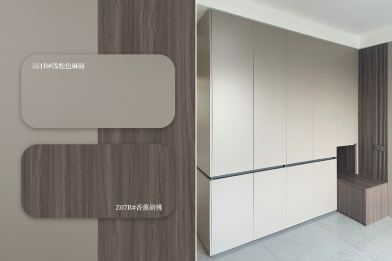 浅驼色麻面 + 香薰胡桃木 浅驼色麻面质感细腻沉稳,香薰胡桃木增添肌理层次,意式极简中透出低调高级感。